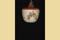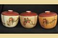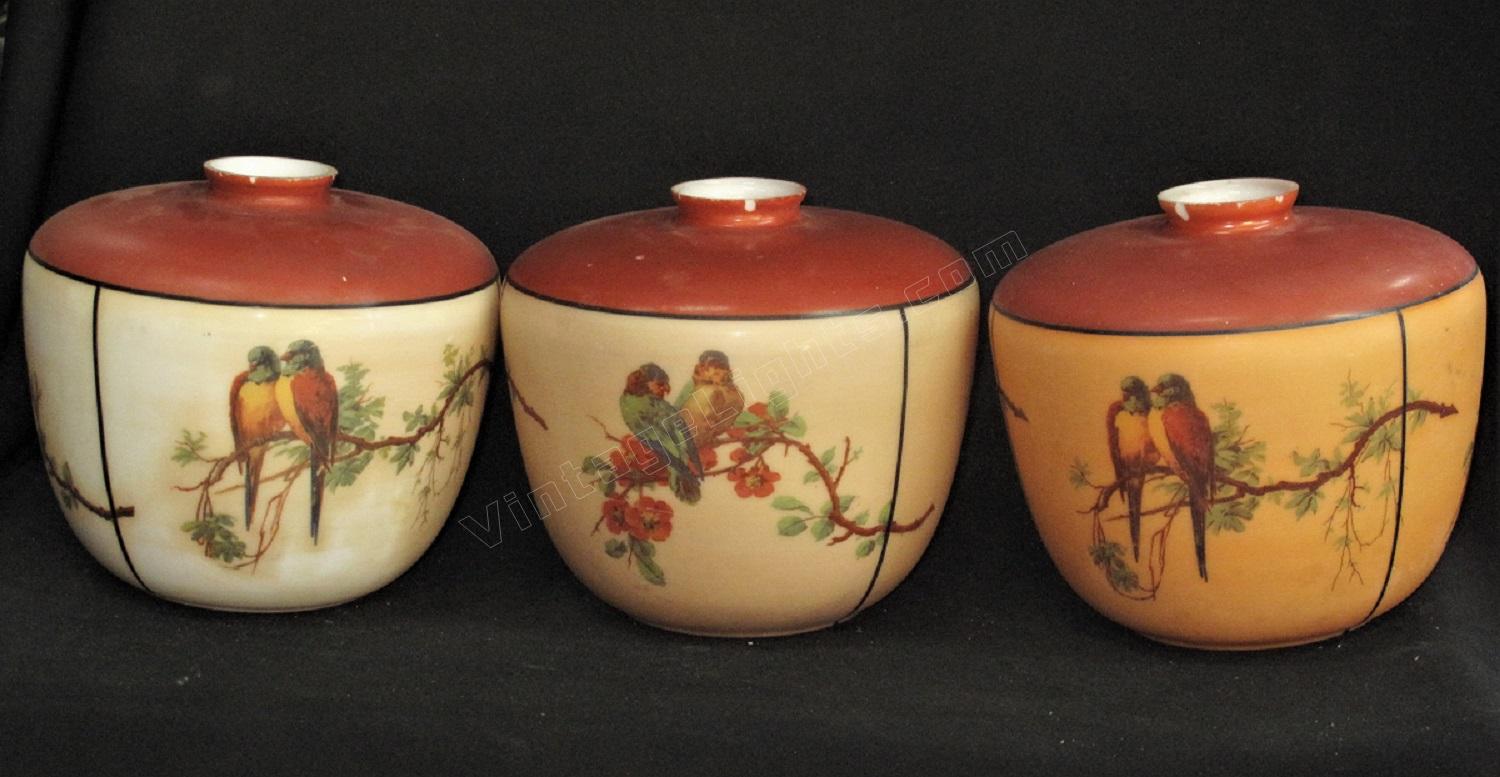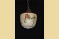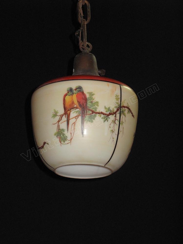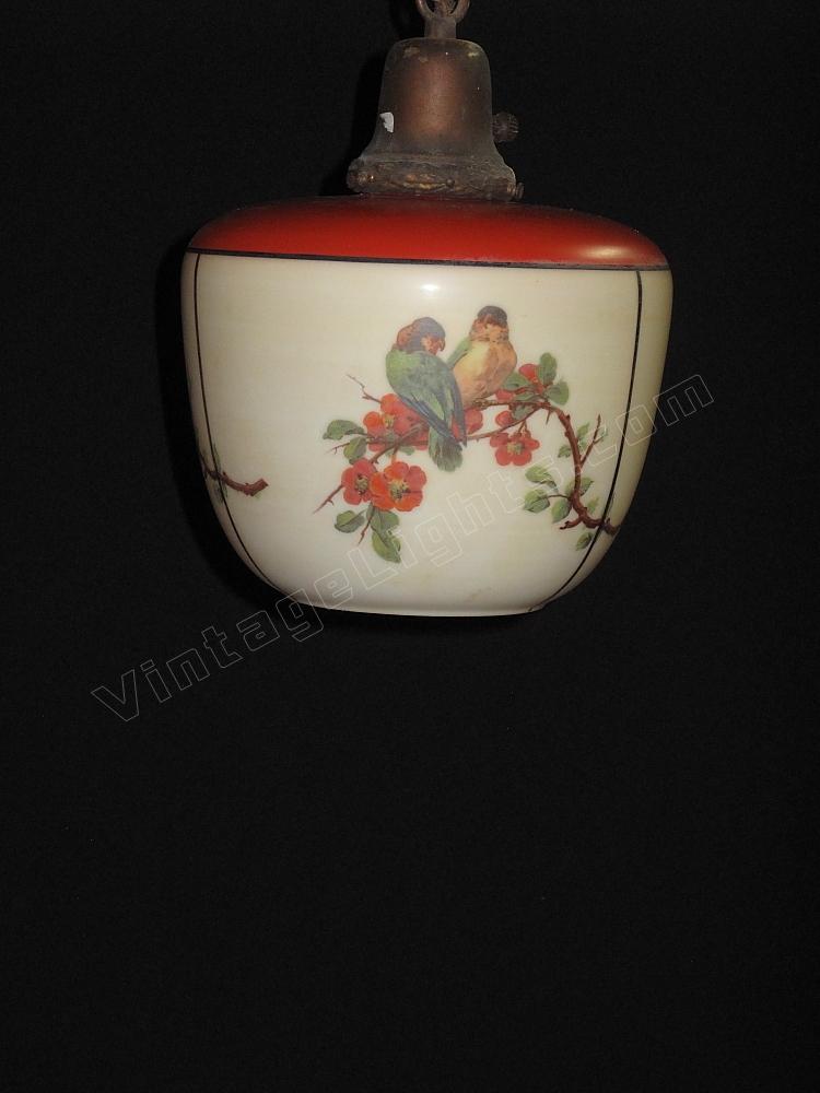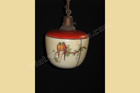 Vintage ceiling globe decorated with 3 panels of parrots and with a red top. Painting on them is excellent condition with some differences in them. Shown by itself but the price includes your choice of vintage fitter, flush mount or chain hung. We have new fitters for them as well. Great accent fixture for a vintage kitchen nook.
