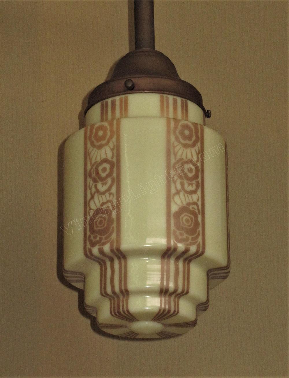 Six waterfalls of tan stripes and art deco inspired flora surround the stepped cylinder custard globe, all meeting around a button at the bottom. The way the stripes follow the contour of the stepped shoulders create a feeling of movement, like watching someone slowly pulling taffy.