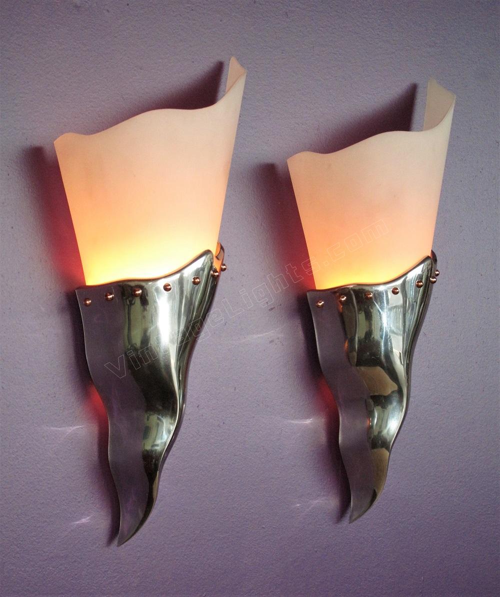 Wonderful feminine curves, with a backbone, are the standout features on this set of French made Mid Century sconces. At 21 inches high they are also are a commanding presence in any room they care to occupy.
