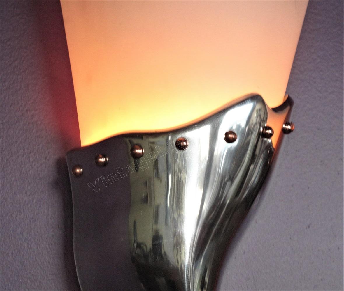 Polished aluminum frame is heavy and well made. Adorned with a necklace of pearl shaped copper rivets and topped with a curved, undulating acrylic shade. The sconces sit proud of the wall by about 1/2 inch allowing a nice shadow accenting the body. (Another reason why fixtures should always be show lit)