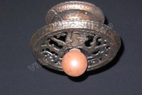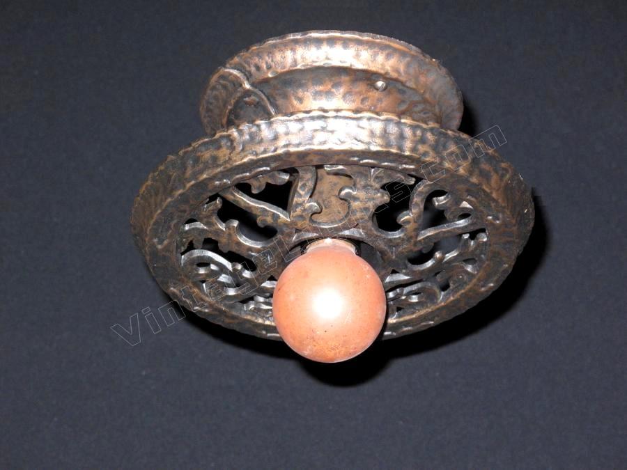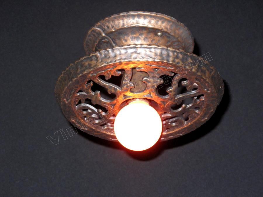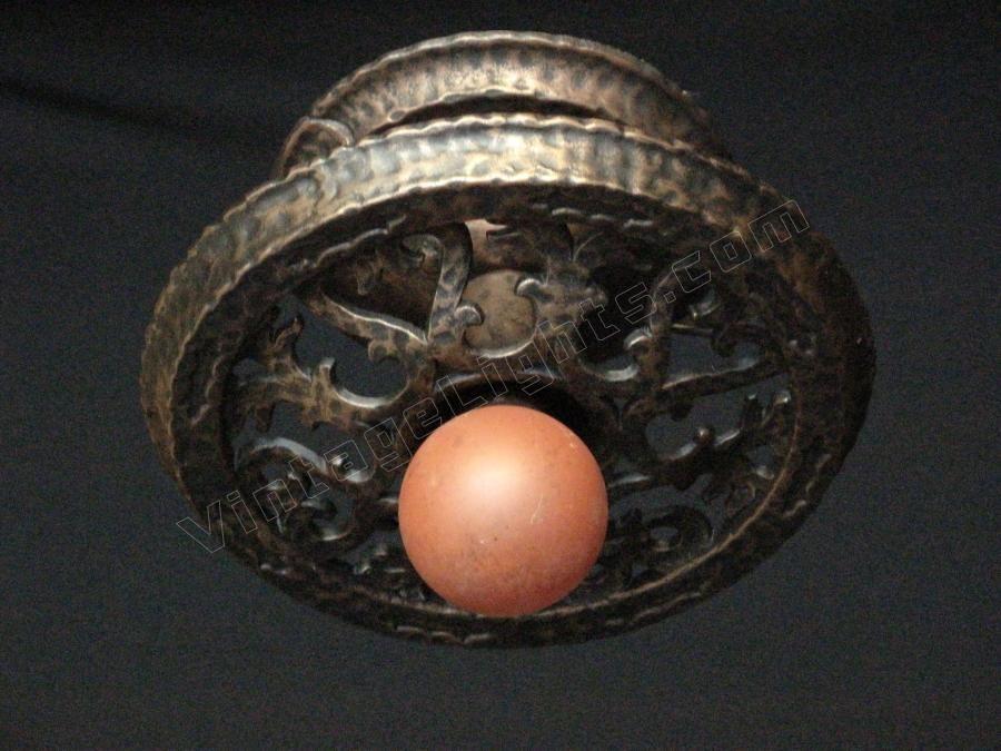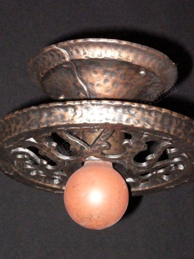 The hammered finish and hand wrought look lend to an Arts & Crafts or Craftsman feel while the open casting give it nod towards the Spanish Revival school.