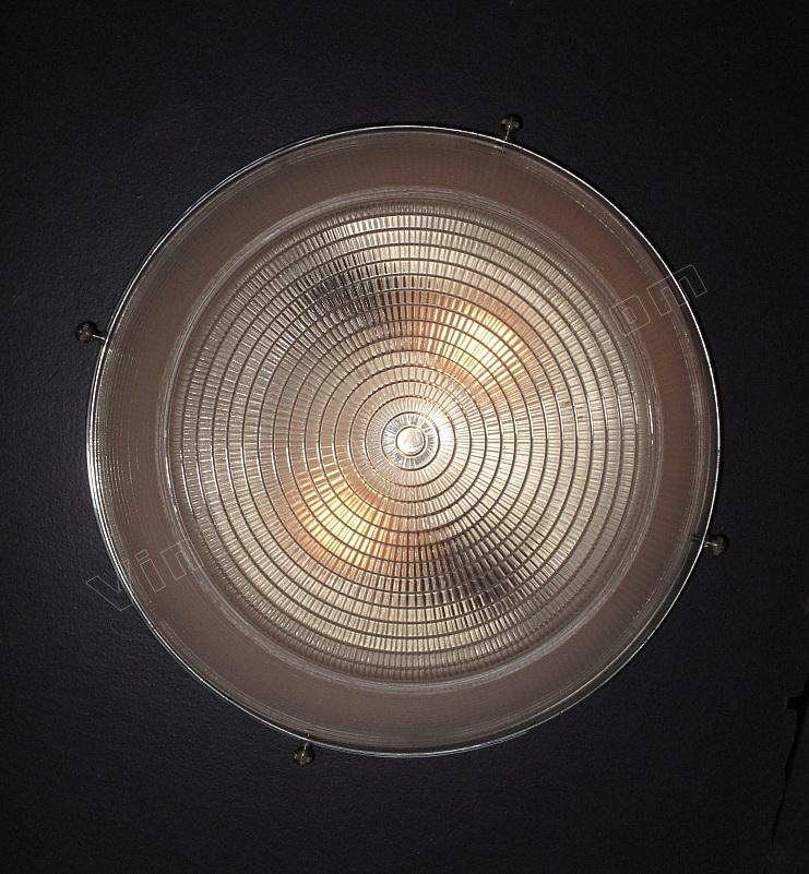 Vintage flush mount ceiling fixtures designed for the low ceiling Ranch style and Mid-century homes of the '40s and '50s. Classic and pleasant design. A very low profile at only 5 1/2 inches and wide enough at 12 inches to house two 60 watt light bulbs. Don't be fooled by their innocent retro demeanor, though, as they could easily find purchase in a cottage style kitchen or seaside bungalow.