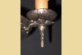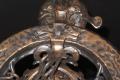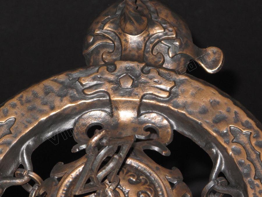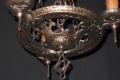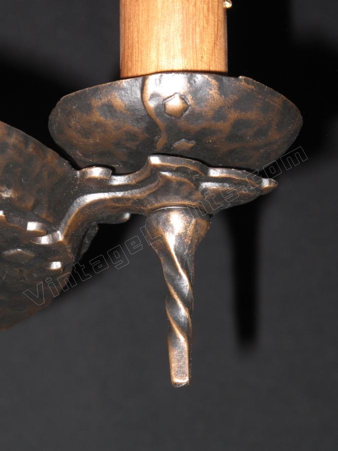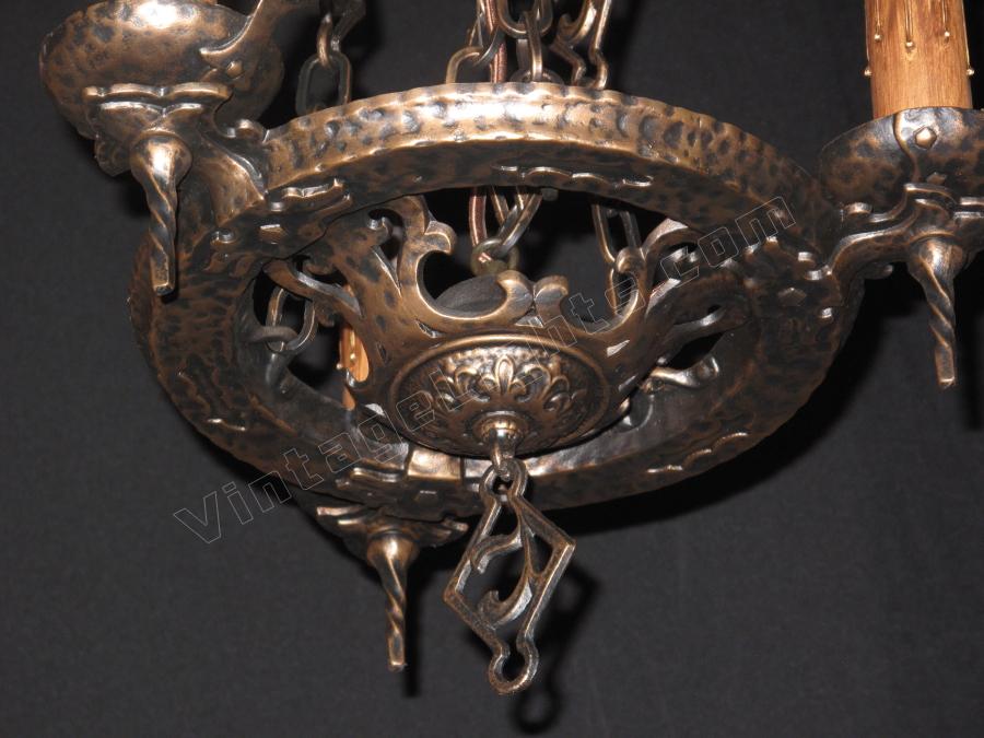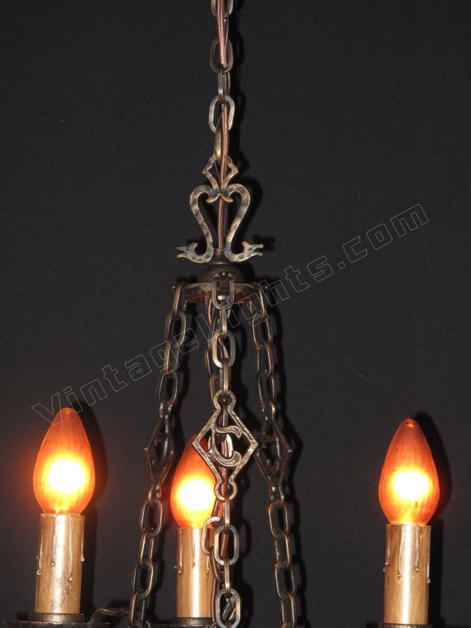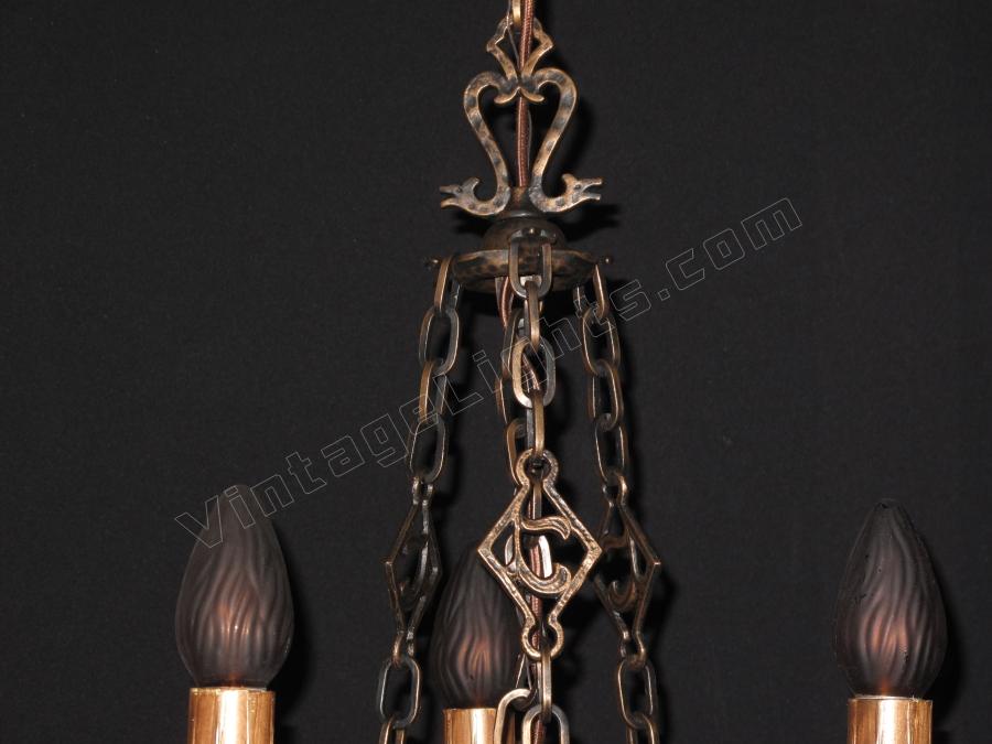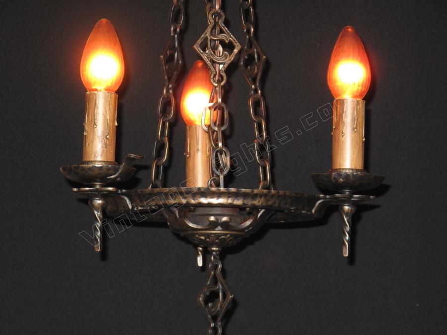From the early 20's when the "Romantic Era" of design was in vogue comes this beautifully restored 3 bulb vintage light fixture. Dramatic drop over a dining room table in those smaller Bungalow dining rooms. Note "Dogs Head" motif on this antique ceilling light fixture and on the top of the chain "spreader". Refinished in antique bronze. Great for an Arts & Crafts 0r revival stairwell, entry, or nook.