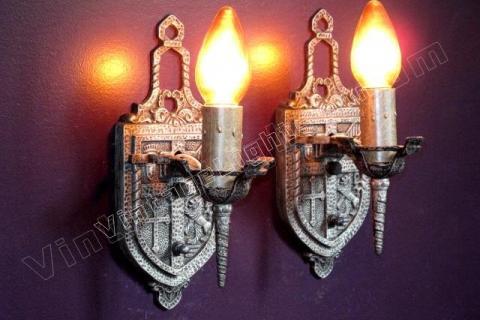 1920s Pair Heraldic / Tudor Wall Sconces in Pewter