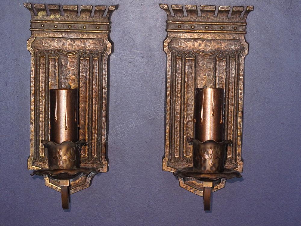 Castle top sconces with a folded drape design against a cast brass hammered finish. Original finish and patina. Single light bulb on a goose neck twisted arm with a four point cut out on the socket shield. With many different design elements incorporated into the design these will fit seamlessly into many diverse architectural styles, Craftsman, Tudor, Arts & Crafts, Bungalow, Gothic, and any of the revival styles including Spanish Revival.