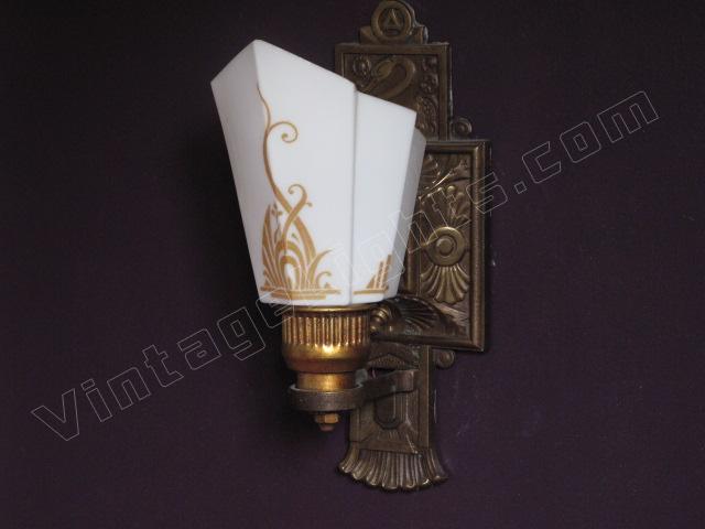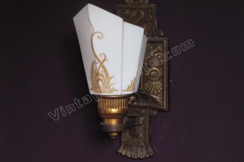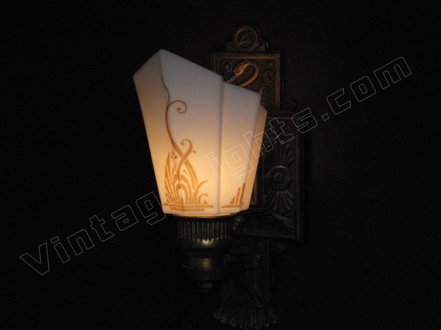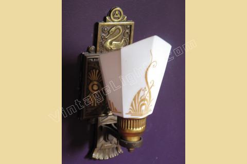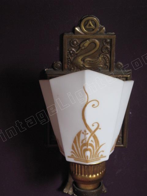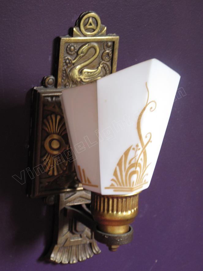 3 Slip Shade wall sconces signed Moe Bridges on back. The Swan was one of Moe Bridges Co trademark designs. Stylized flowing lines on shade miminc both the Swan's feathers as well as the pondside folage. Original patina, color and shade make for a stunning accent wall light for bedroom or bath.