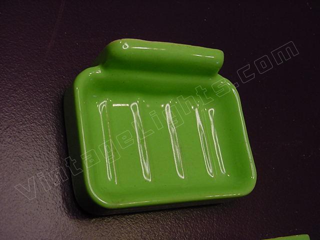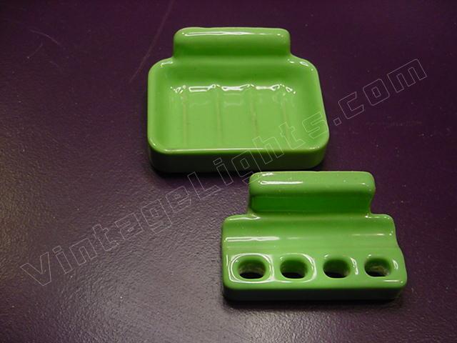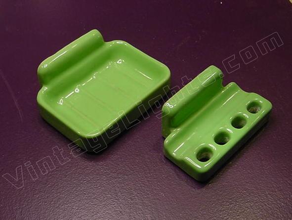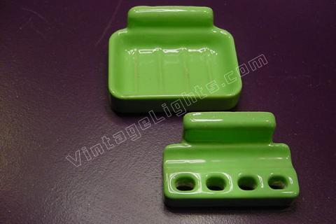 Matched 2 pc set of rare vintage green bathroom hardware fixtures. Soap dish and toothbrush holder. Excellent condition with mounting brackets included.