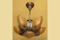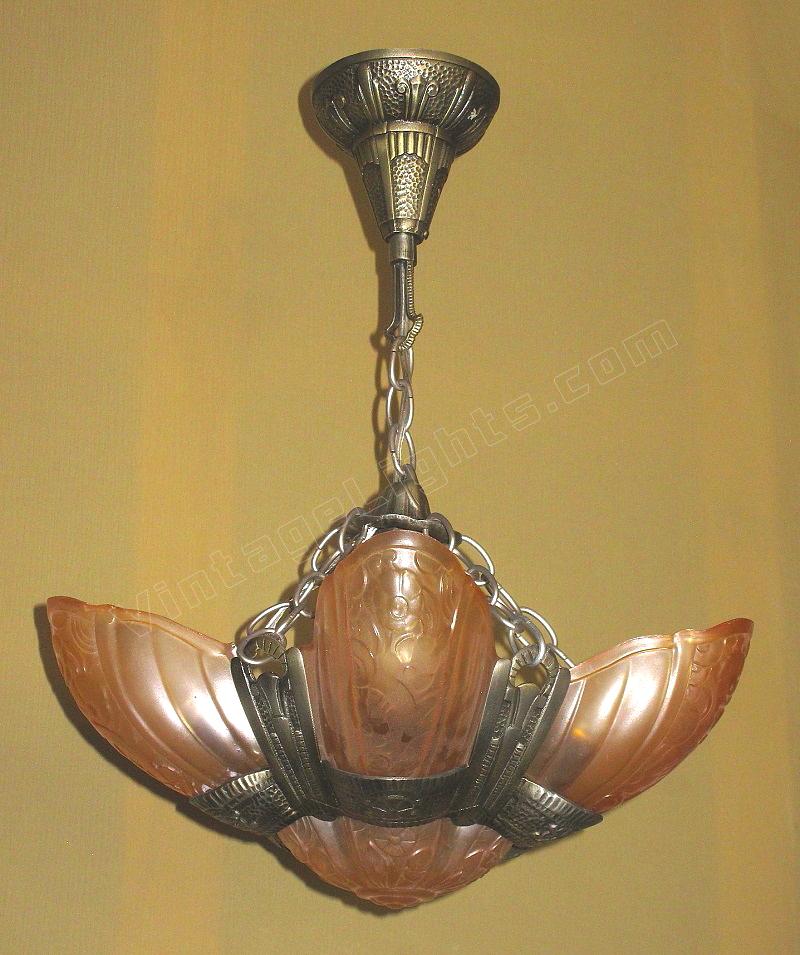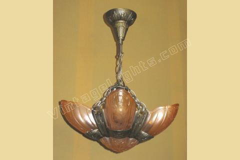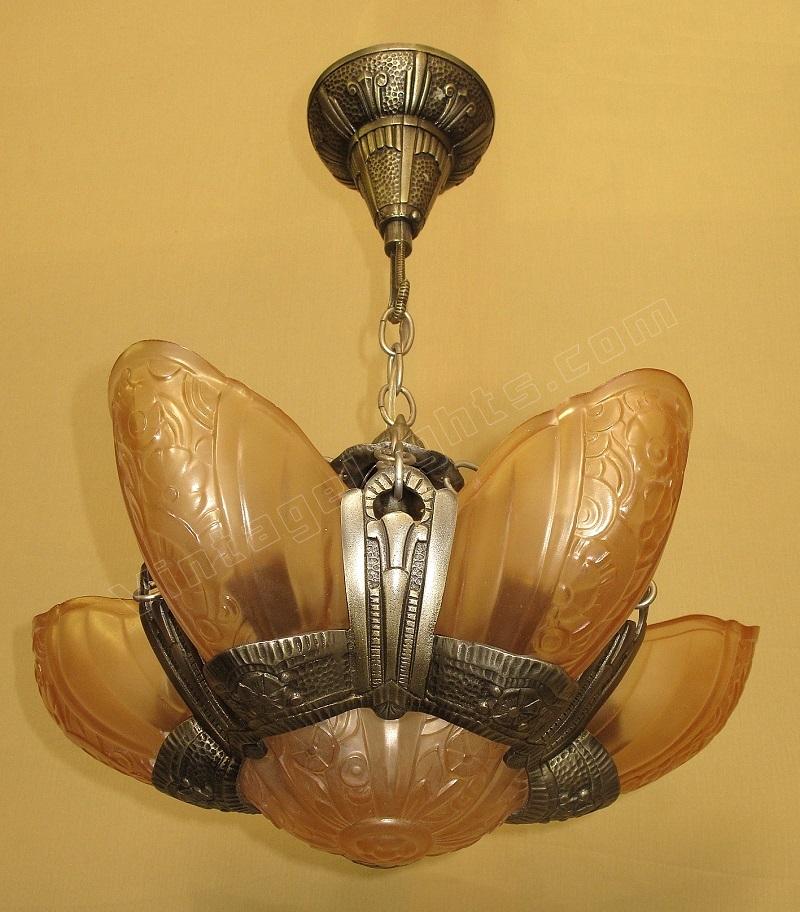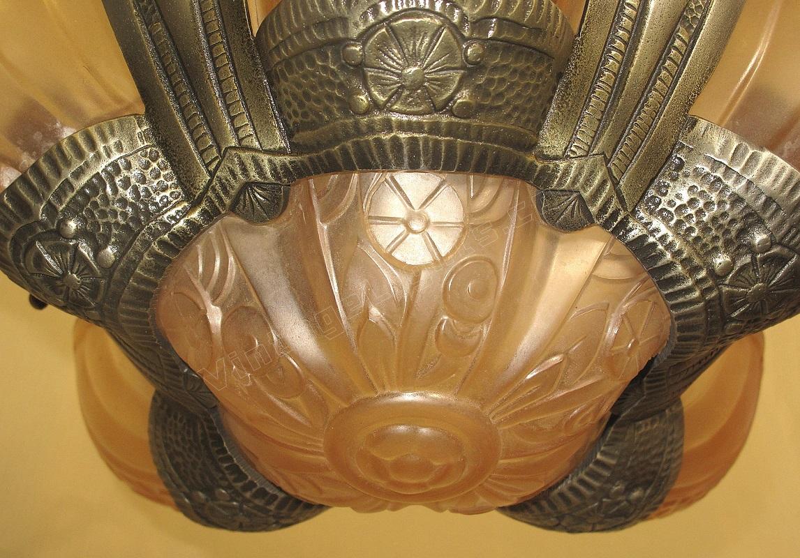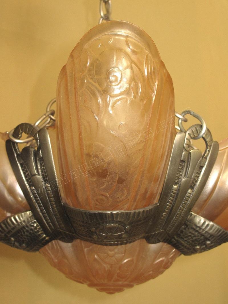 The largest of the "Fleurette" series by Lincoln is this 6 slip shade fixture with 7 bulbs. Two bulbs light up the bottom piece of glass. Refinished to match one of the original finishes offered at the time of manufacturer, around 1928.