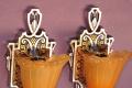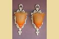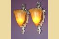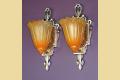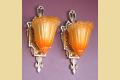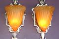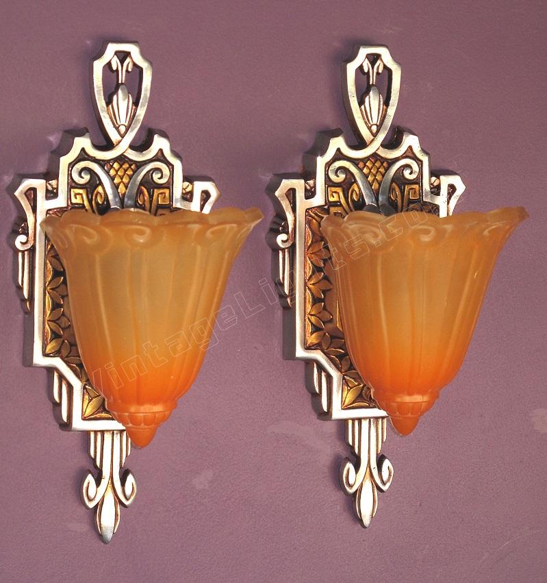 Restored to their original glory with highly polished aluminum accents and sides, repainted in their original color of sunset golden highlighting the spectacular Art Deco design, and original orange tinted shades. New sockets, wiring and new painted on/off switches complete their restoration.