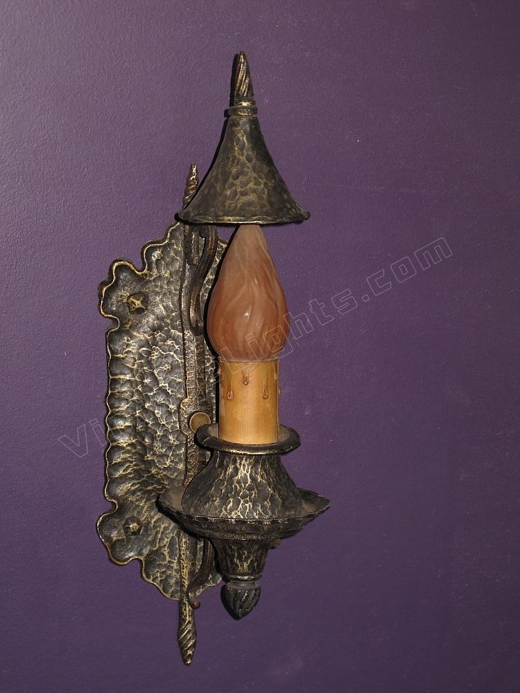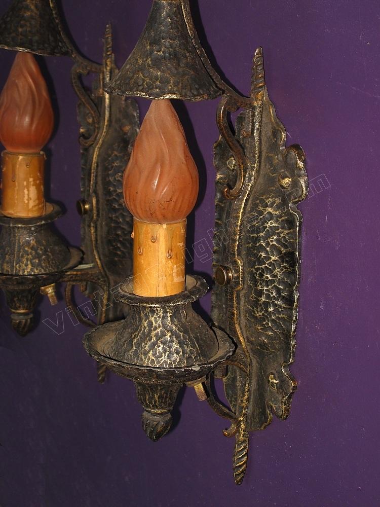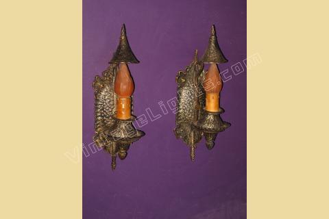 These antique wall sconce fixtures in the Storybook style come from the 1920s when this purely American style was popular. This style was a marriage of Arts & Crafts, Revival, Craftsman, Bungalow, and Cottage Tudor.