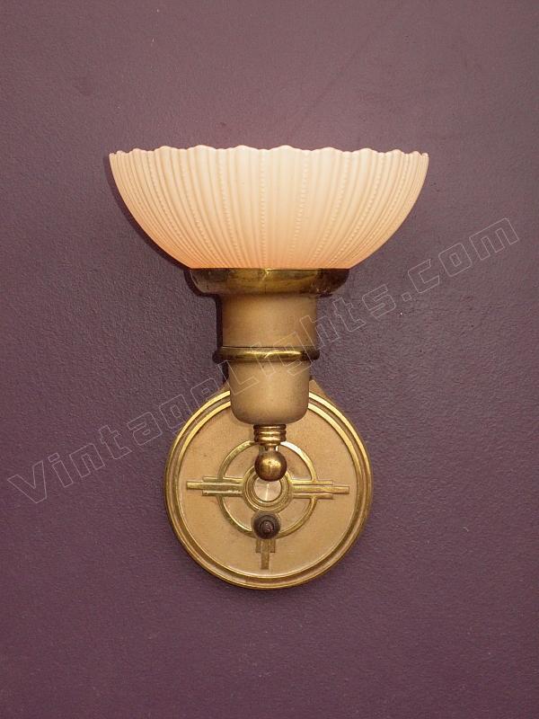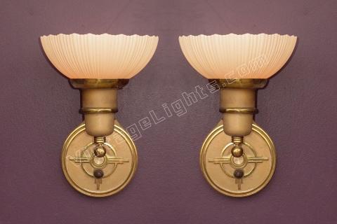 From the early '30s is this pair of vintage wall sconces. With Art Deco as well as Classic design influences, these were designed to fit into any style of architecture of their day, with even a nod to the Southwest design. And the same holds true today: they fit in with any décor style. Painted backs and socket covers with polished brass highlights. Fixtures are solid brass.