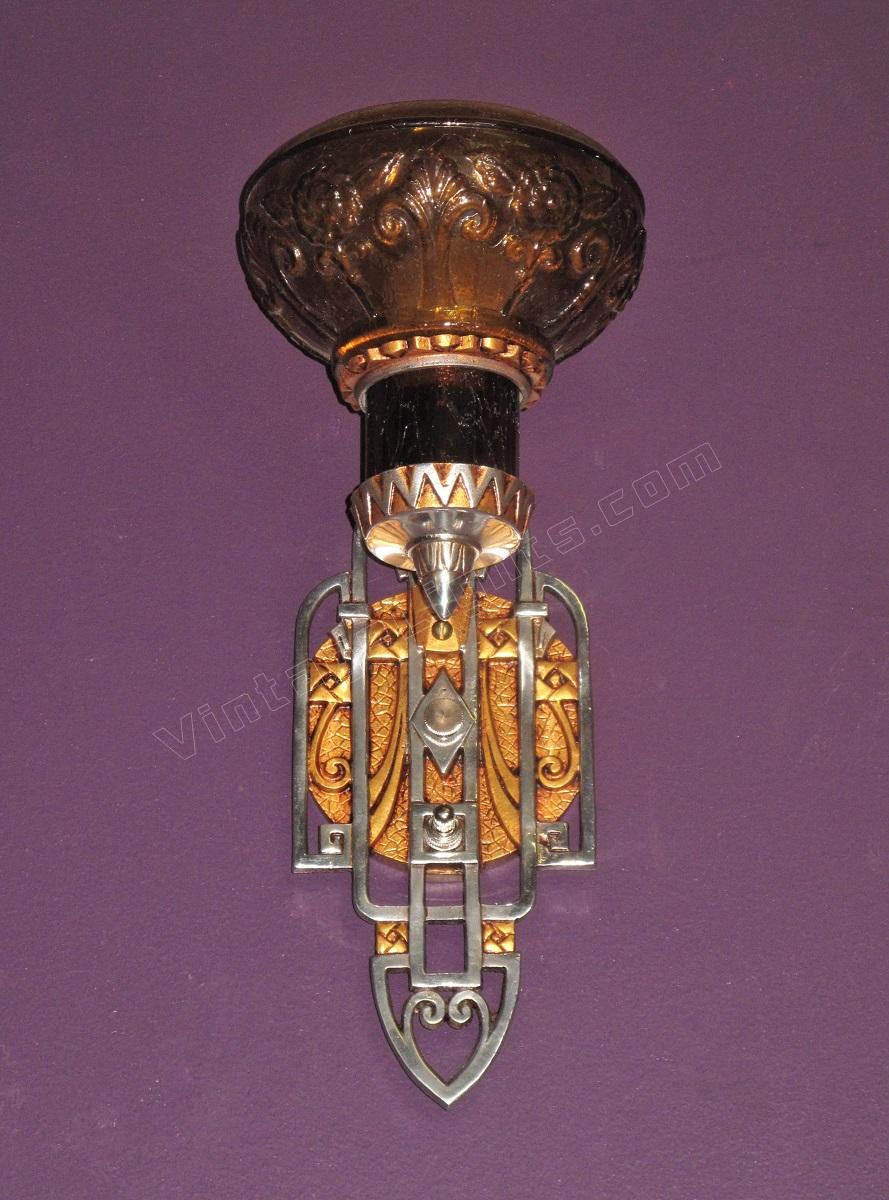 One of the more unique pair of sconces from the period when both Art Deco and Spanish Revival were popular design elements, most likely form the late 20s. Lots of deco inspired designs on the back plate and a Revival inspired glass shade and shade holder. The fixture is aluminum with repainted antique golden to match the original color and the silver areas are highly polished aluminum.