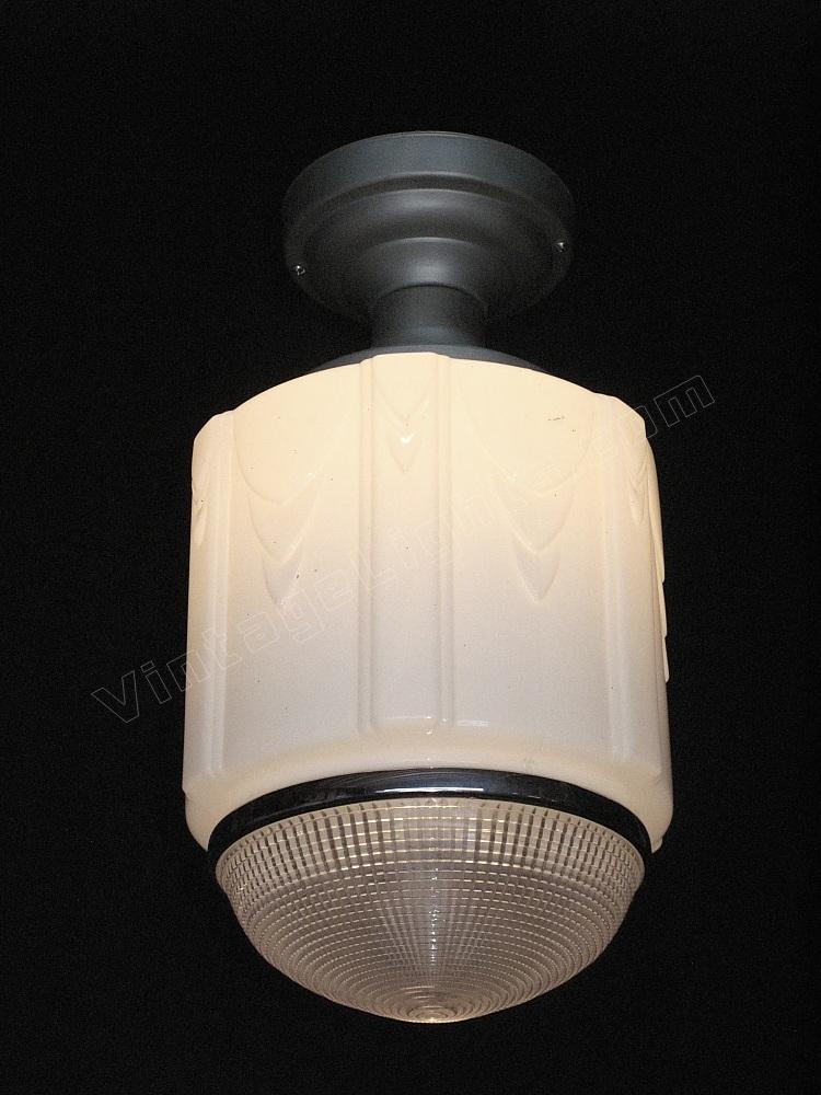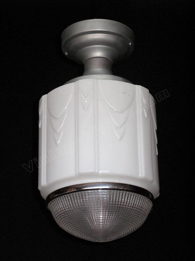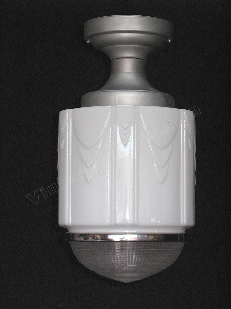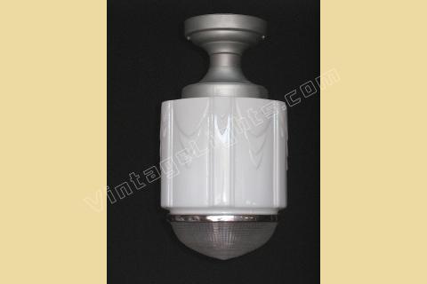 Although shown on a vintage flush mount ceiling fitter in brushed metal, any of these schoolhouse lights can be dropped on a chain or pole if a pendant look or longer drop is required. The fitter is also available in chrome/nickel or painted to match your interior. Alterations from the flush mount ceiling fitter in brushed metal are charged at our cost only. UL listing is available at an additional cost.