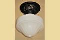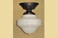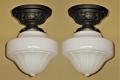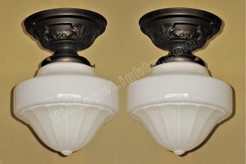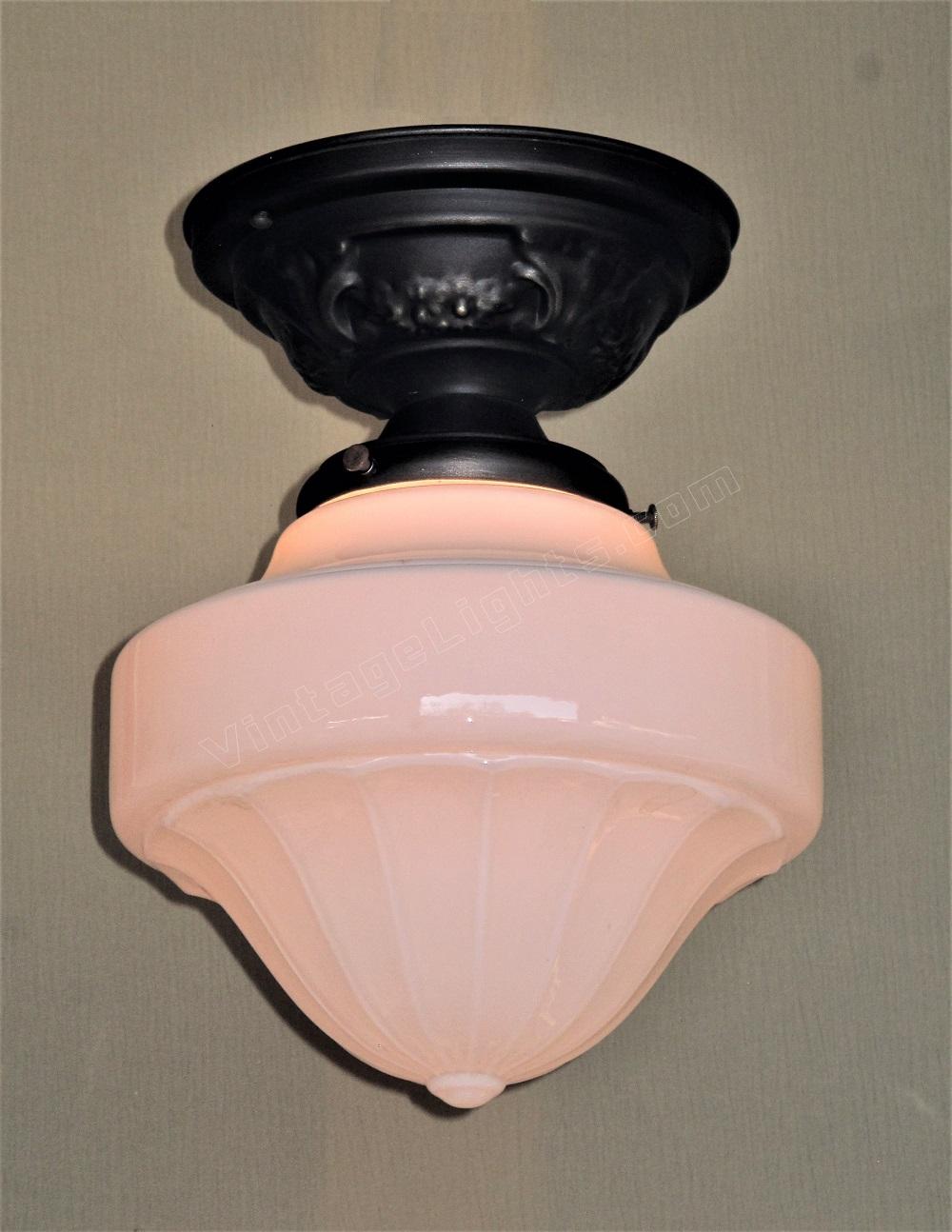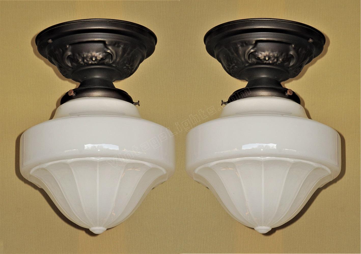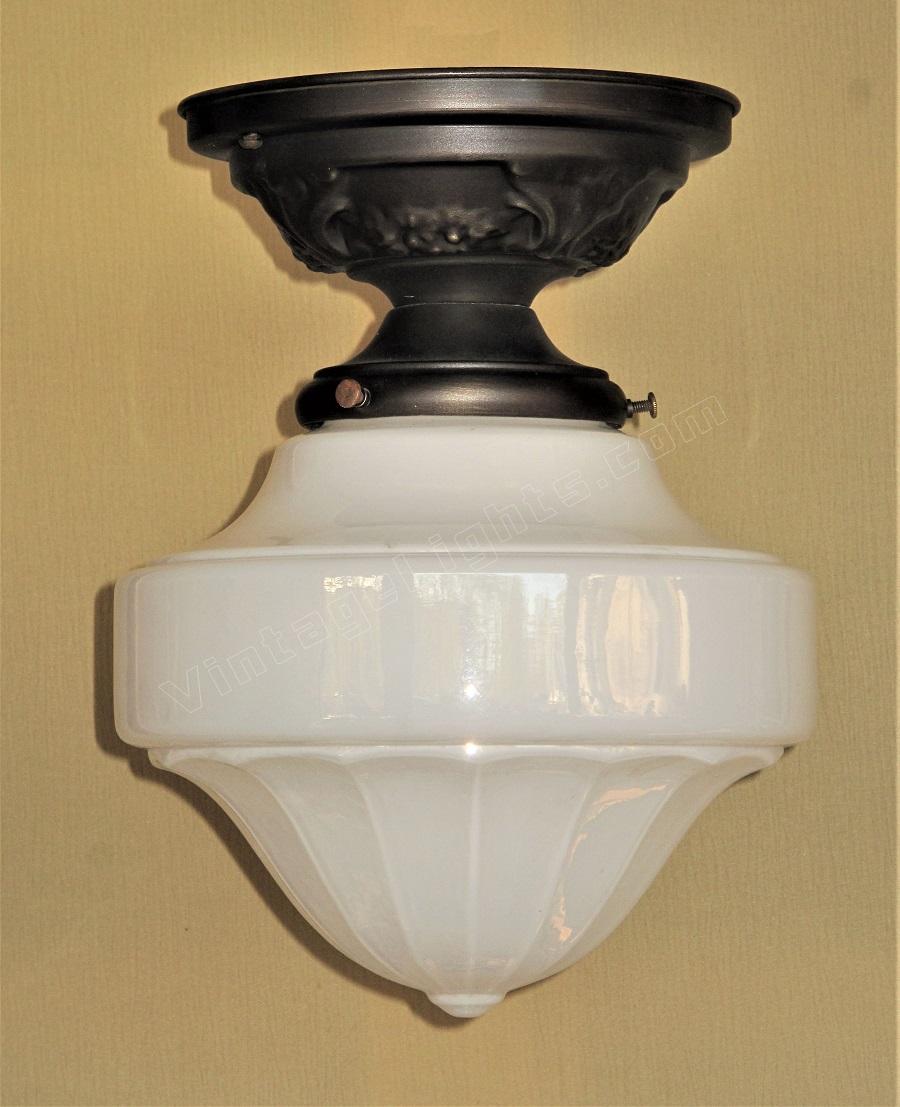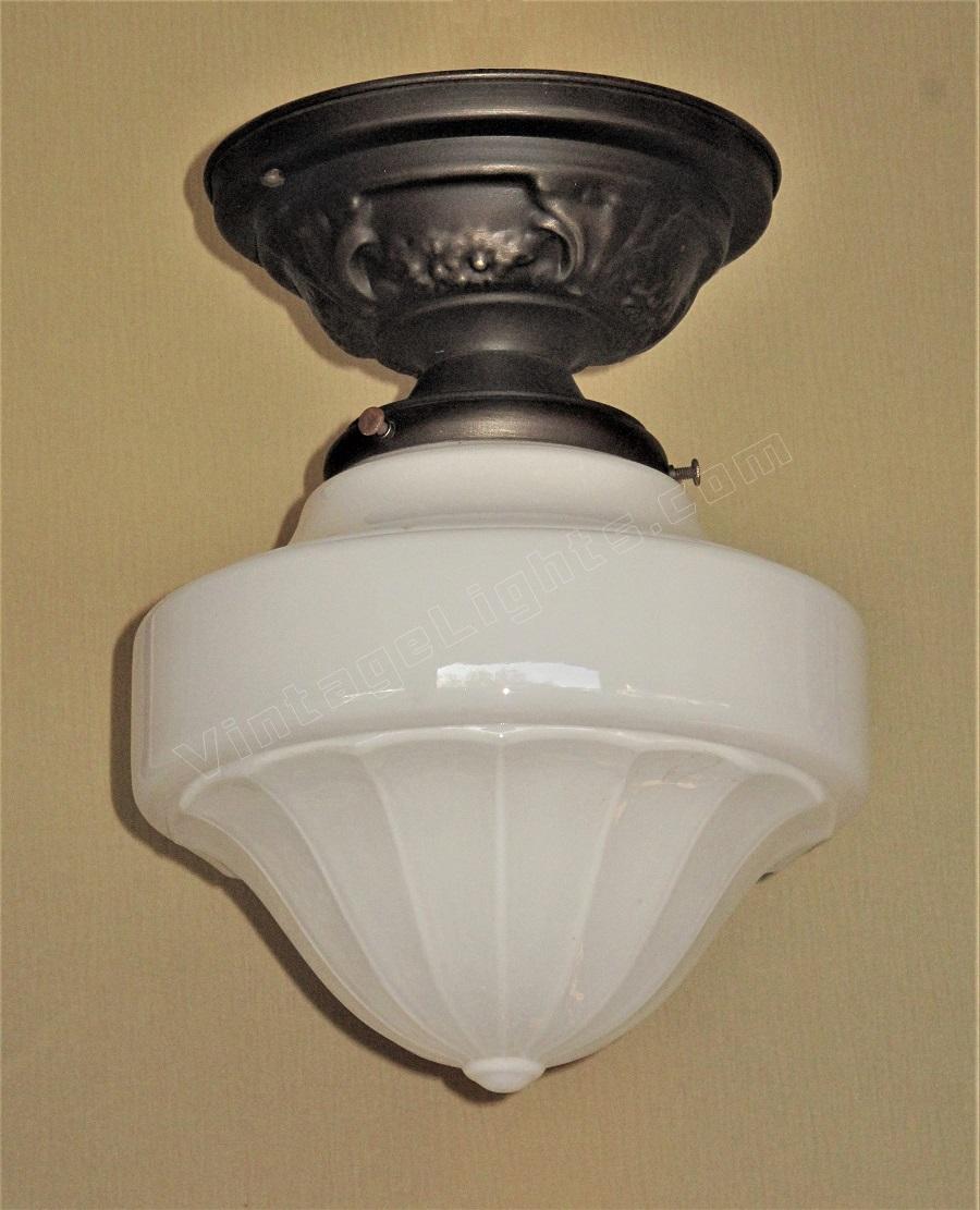 Just one milk glass vintage shades on brass ceiling fitters. Perfect for a bungalow kitchen or bathroom. Their mid range size make them a candidate for any room in a cottage, ranch, craftsman or bungalow home.