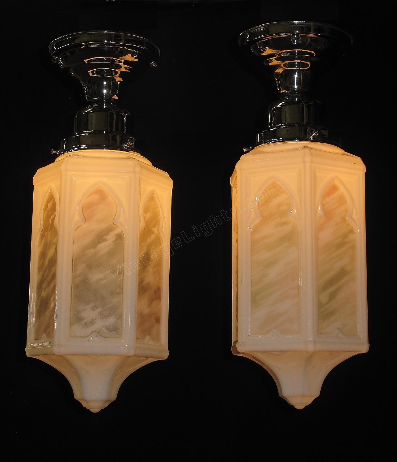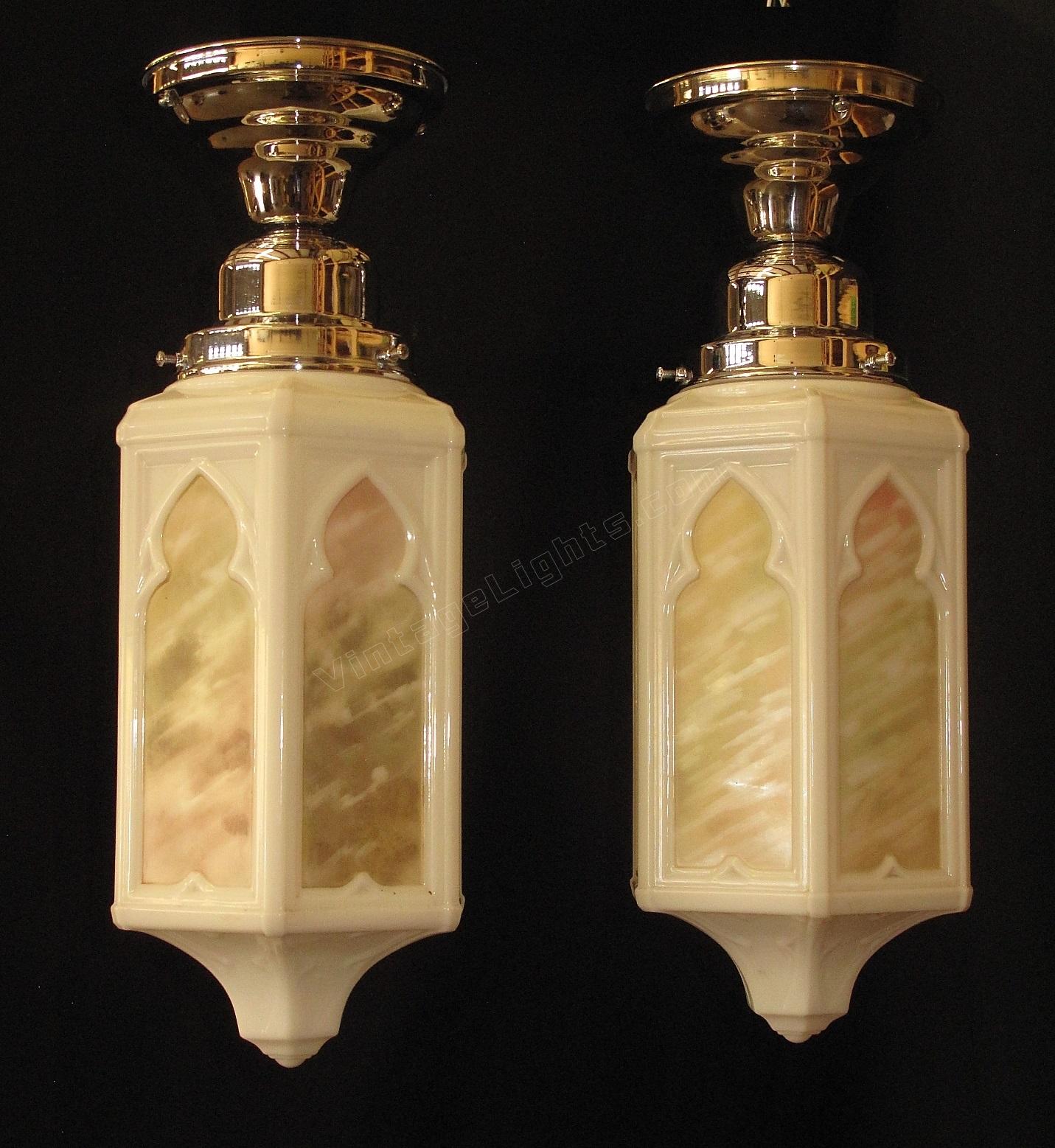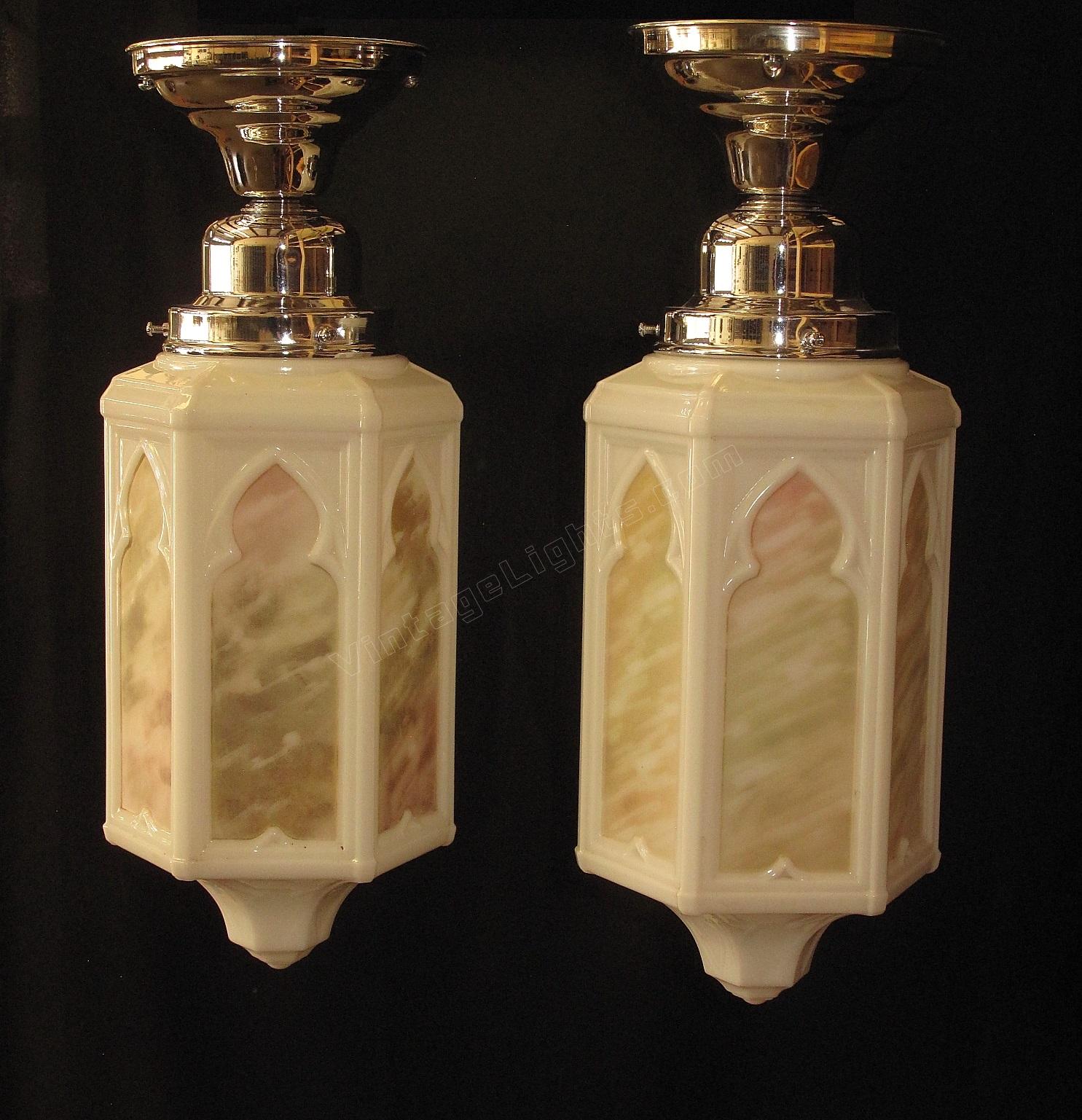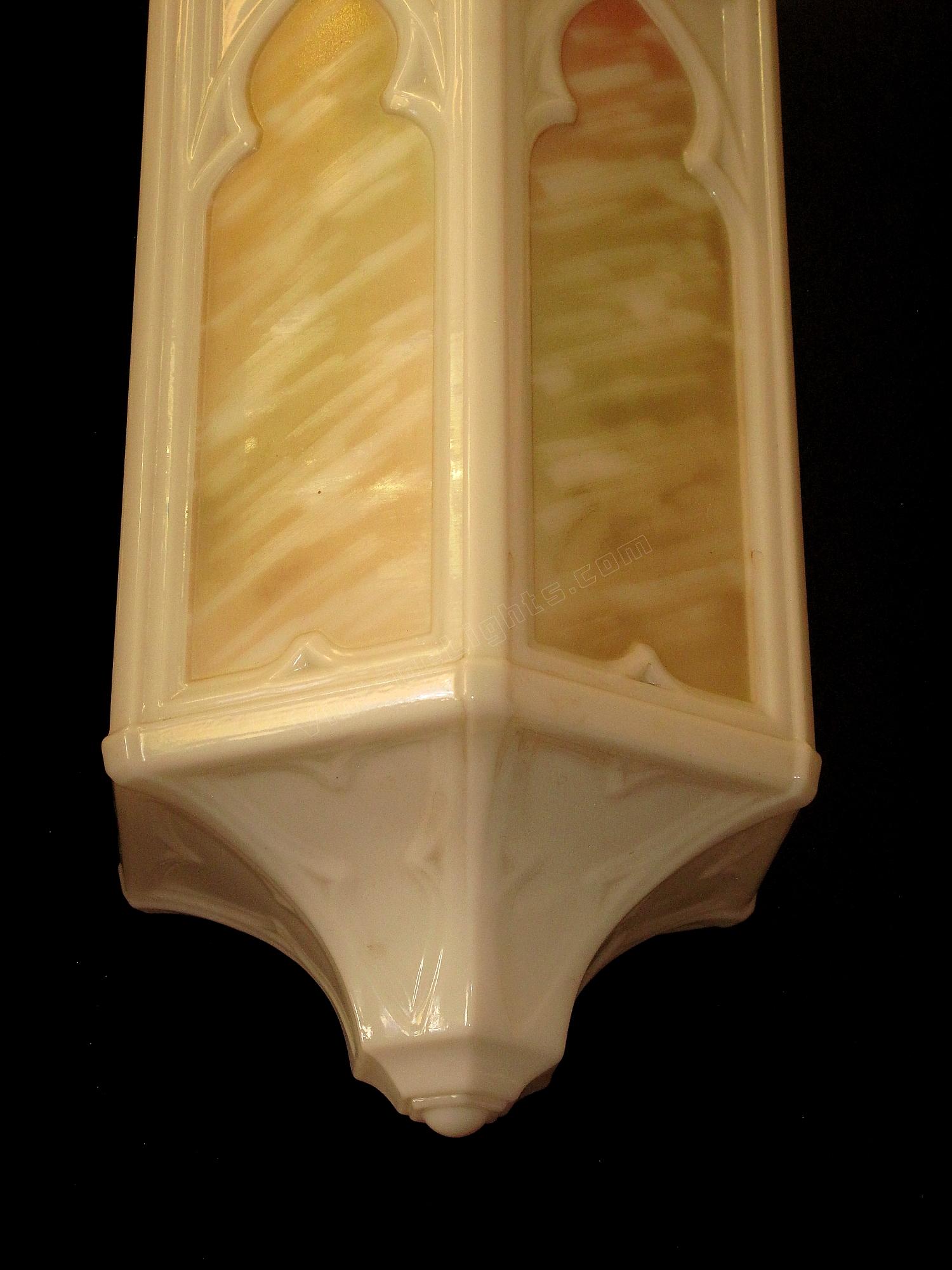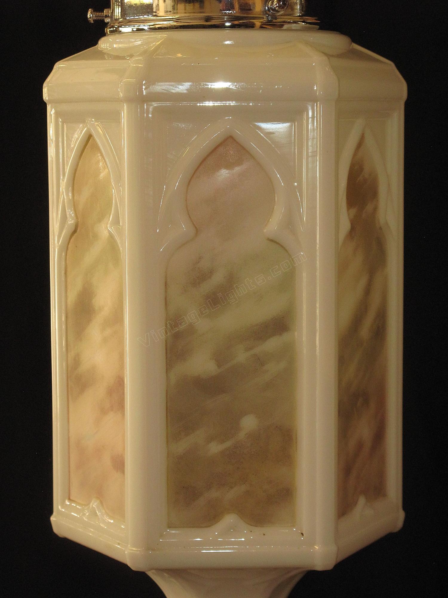 Moorish or Keyhole arches at the top of each panel and a Trinity star at the bottom. Milk glass bodies with a fired on pattern of rainbow colors. Matching larger ceiling fixtures and matching sconces also available.