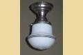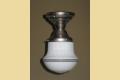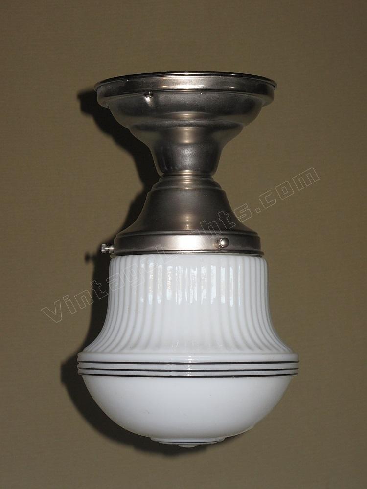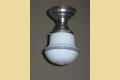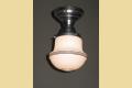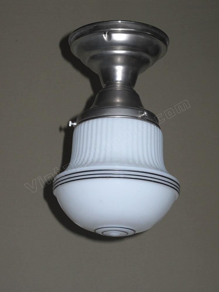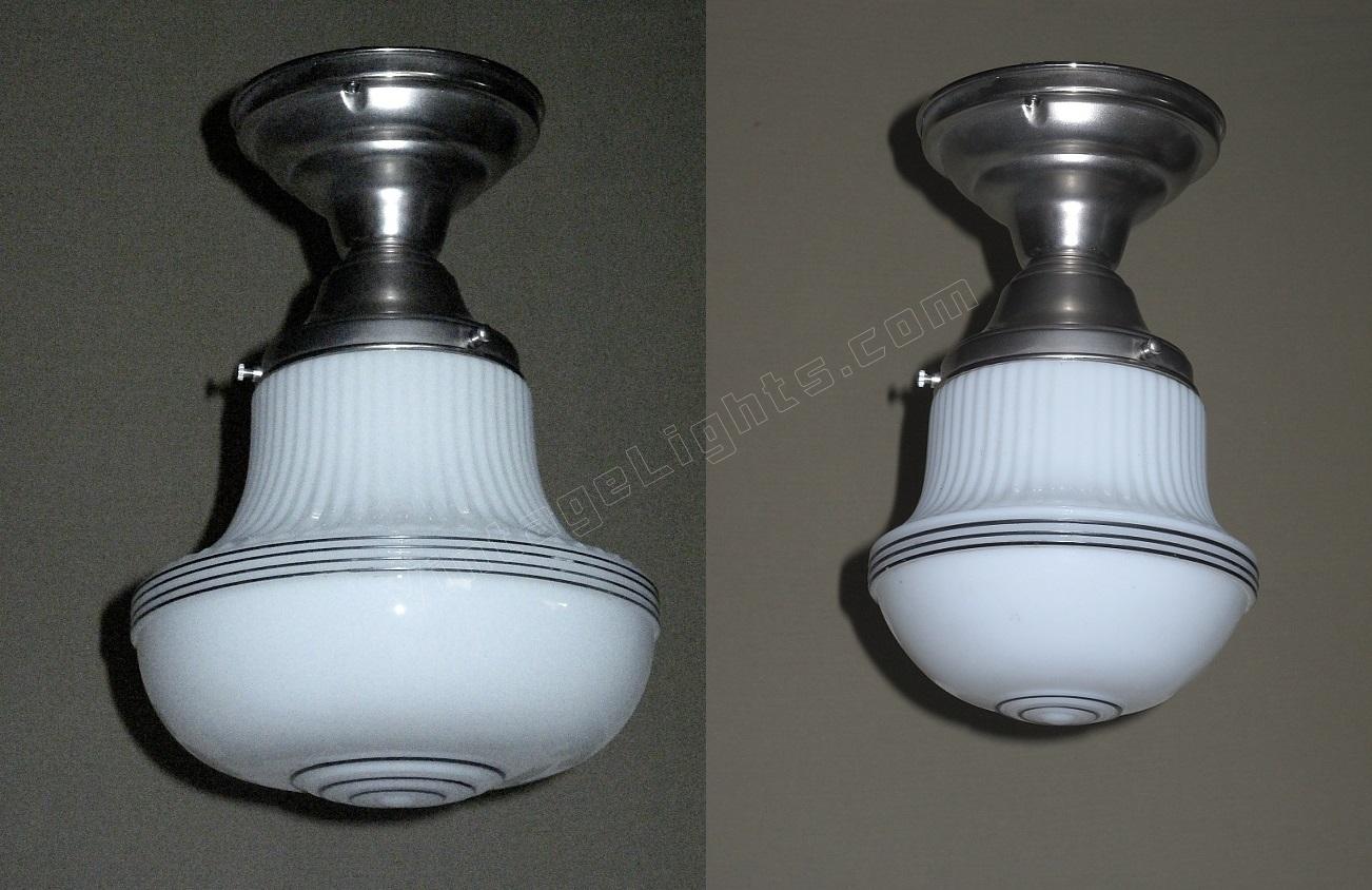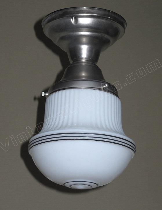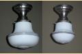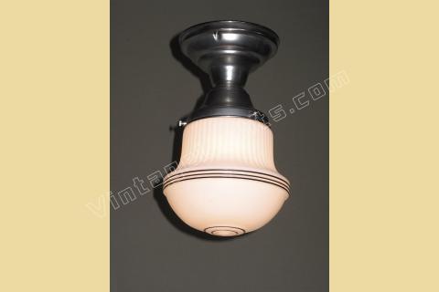 These older antique glass globes enjoy an Art Deco influence in design. Shown on new Nickel fitters. Nice black accent detail for a vintage inspired kitchen or bath in any bungalow or cottage. As with many of the milk glass shades of the 20s through the 40s, these also came in different sizes. We have 2 sizes available, as shown in the last image, and this one is the smaller one, perfect for a pendant over the kitchen sink or bathroom vanity.