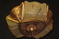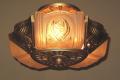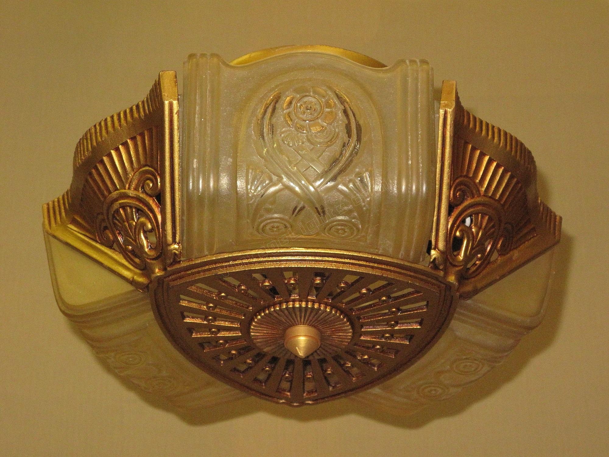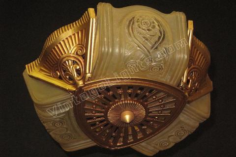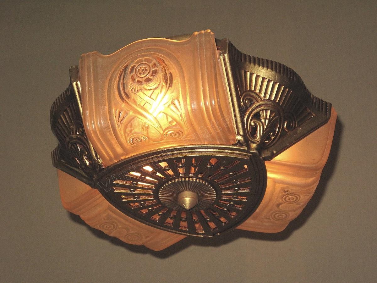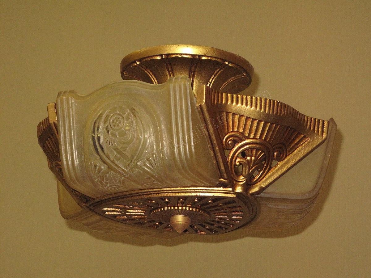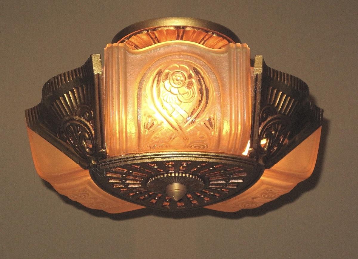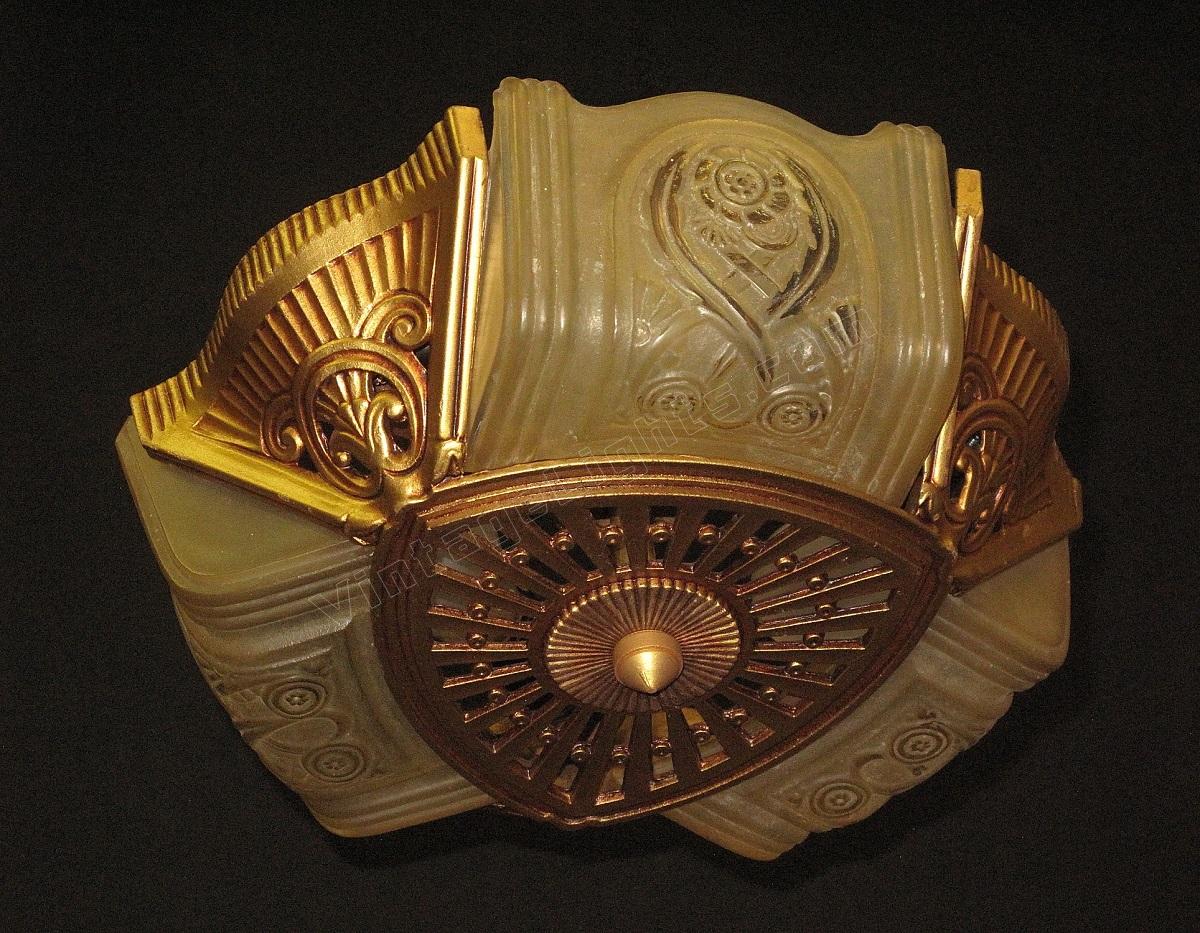 Wonderful Art Deco ceiling fixture refinished in it's original color of polychromed golden. Shades attributed to the Consolidated Glass Co.