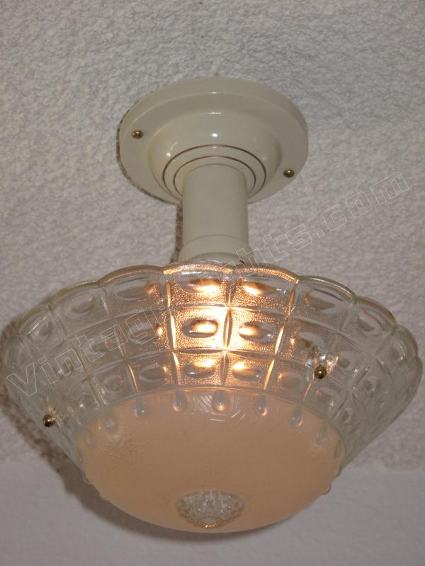 Typical 30s Bedroom Lighting Fixture. Beige colored bowl on 3 chains from fitter