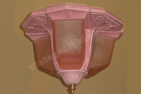 Three slip shade porcelain ceiling fixture in a lavender / pink color. No noticeable chips or cracks in porcelain or glass shades. There is a little paint loss in the hand painted gold accents. Typical paint loss due to repeated cleaning of the fixture but it does not detract from the beauty of the piece. Wonderful addition to a powder room or girls bedroom.
