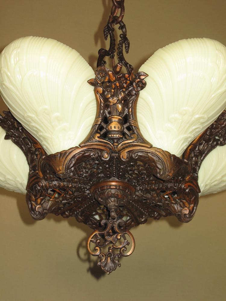 Vintage Bronze with Custard Glass Slip Shades. Deco Rococo Masterpiece. Original Patina