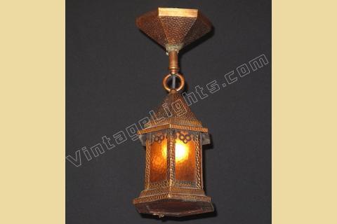 Antique solid copper cottage bungalow style ceiling porch lighting fixture. Has original bottom glass access panel along with original hand wrought clasp. Wonderful uniform hammered texture nicely fits with the "hammered" texture of all the original vintage amber colored glass pieces. No chips or cracks in the glass. Additional design element at the top of each side glass panel, sort of a stylized "owl eyes" motif. Looks to have a possible repair around the set ring at the bottom of the ceiling canopy. All soldiered joints are still tight with no open seams found. Internal wiring has been waterproofed for outdoor use.