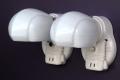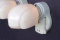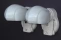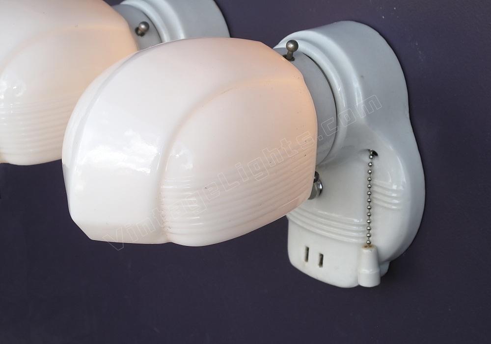 Vintage pair of white porcelain wall lighting sconce lamps. The fixture is circular in design with intersecting horizontal lines. Antique shades are reminiscent of the streamlined car hoods of the early '30s.