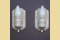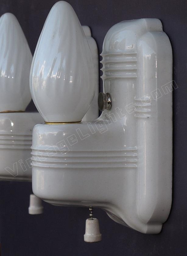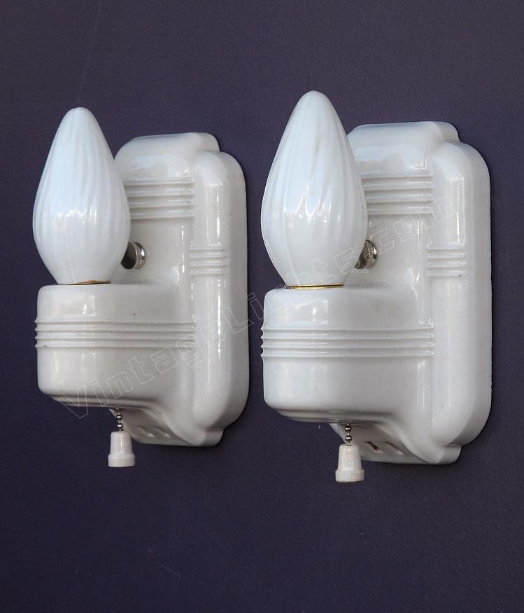 Vintage pair of 1930s - 40s white porcelain wall light fixtures made by Paulding. The softly rounded corners are nicely balanced by the strong horizontal lines, showing a subtle Art Deco lineage which does not overpower the simplicity of a common bathroom fixture. These antique lighting sconces are right at home in a vintage Bungalow or a mid-century dwelling.