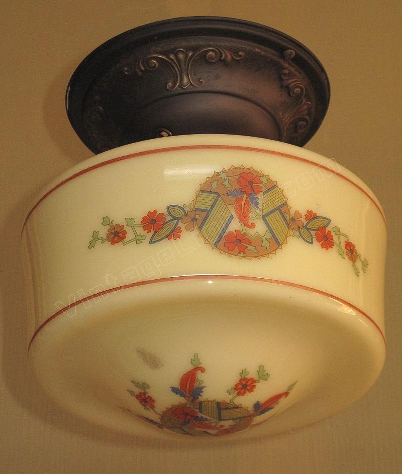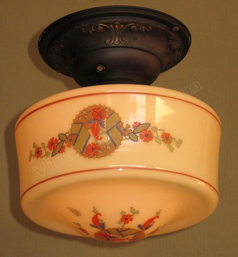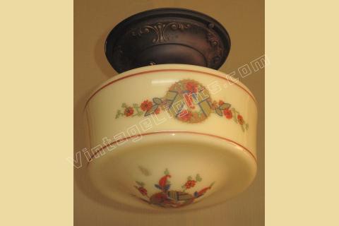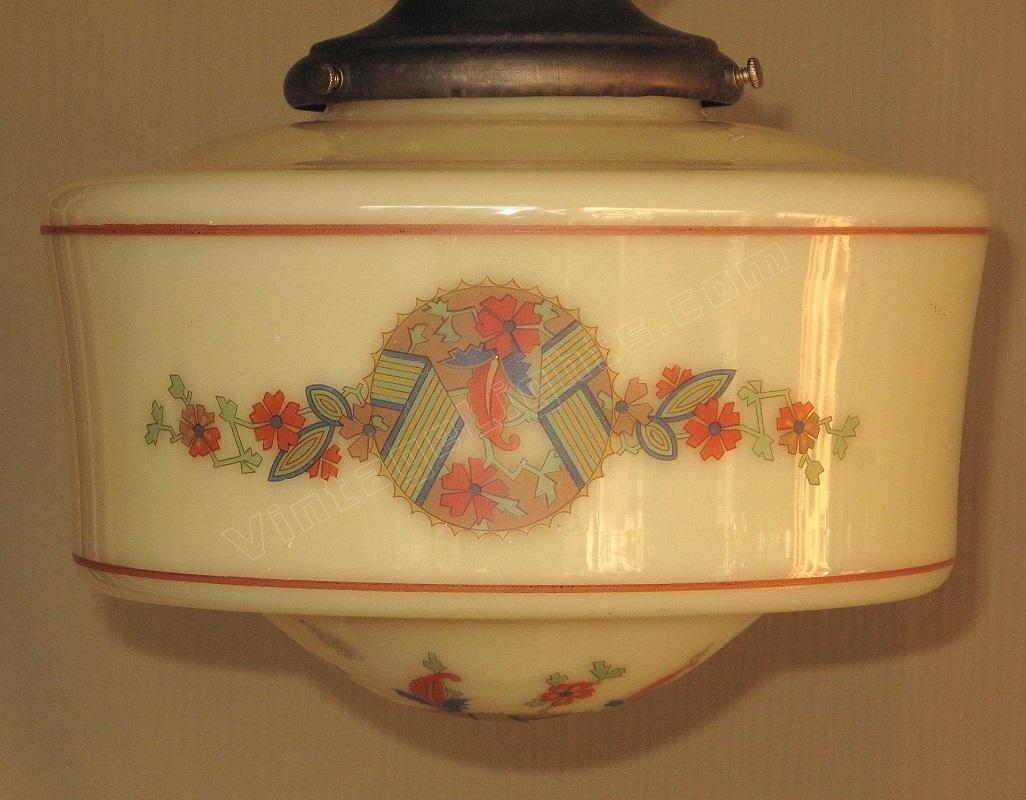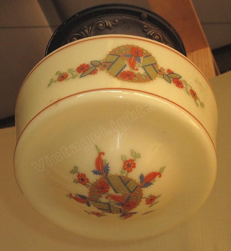 The Macbeth-Evans Glassworks was one of the premier glass shade manufacturers in the US during the first quarter of the 20th Century. Best know for their depression glass dinnerware. Their water mark is visible to the eye but difficult to capture with an image. Wonderful cream colored glass shade with a colorful art deco design which is repeated twice around the globe as well as around the bottom. When lit it casts a pleasing warm glow around the room. All the decorations are in excellent condition with very little fading and minimal paint loss. Shown on a vintage all brass ceiling fitter of the same era. Drop as shown: 9 inches. Could be lengthened on a chain or pole fitter is longer drop is needed. Width of shade: 9 inches.