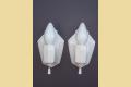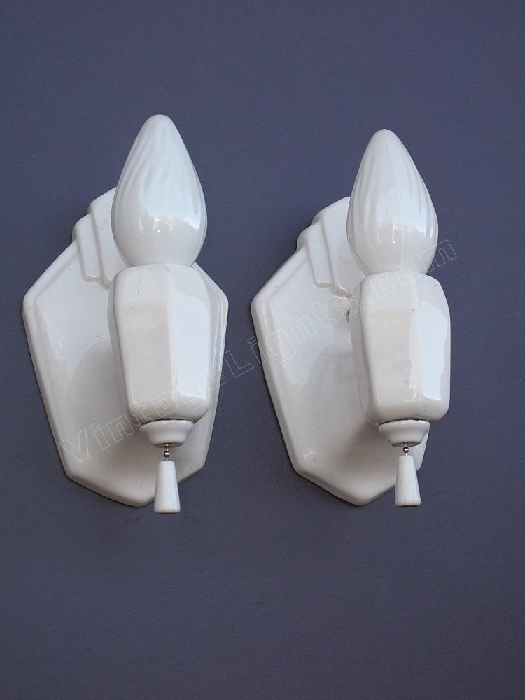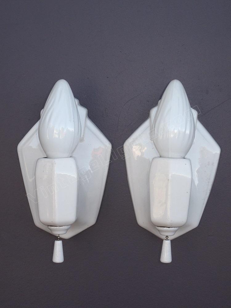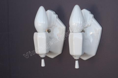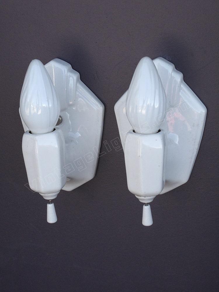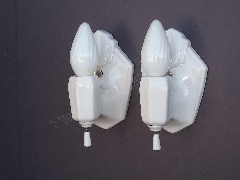 Vintage 1920s / 30s white porcelain bathroom wall sconces. The pull chain socket switch has been completely rebuilt to ensure decades more smooth on and off clicking. Usually found in vintage baths, these wall lamps now enjoy status wherever in the house you place them. There is a slight discoloration inside the glaze on the right side of one of the sconces with a price adjustment for it.