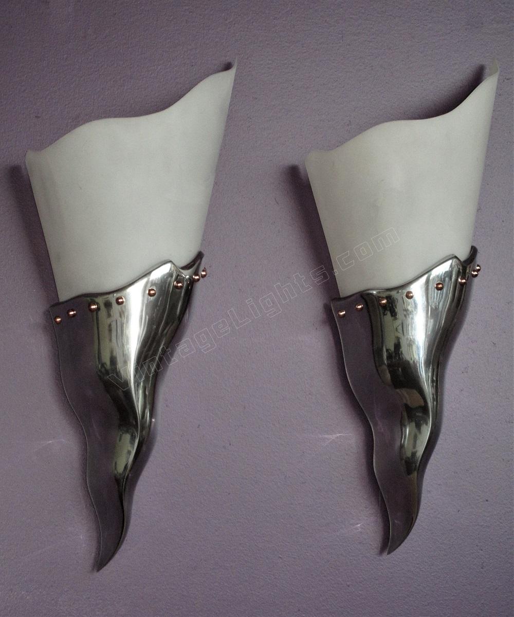 Polished aluminum frame is heavy and well made. Adorned with a necklace of pearl shaped copper rivets and topped with a curved, undulating acrylic shade. The sconces sit proud of the wall by about 1/2 inch allowing a nice shadow accenting the body. (Another reason why fixtures should always be show lit)
