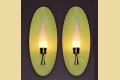 Great Italian styling from the maker Arredoluce. Sleek and sexy, just what you expect from this maker. With a height of 18 inches and a width of 7 1/4 inches these were made for the upscale mid century architecture of their day. The hard plastic concave curved backs in bright yellow are in excellent condition with on only a few very minor scratches. Shades are original to these fixtures. Rewired using original sockets with original shade retainers still in place. All visible metal is solid brass including the original j-box covers with original mounting screws.