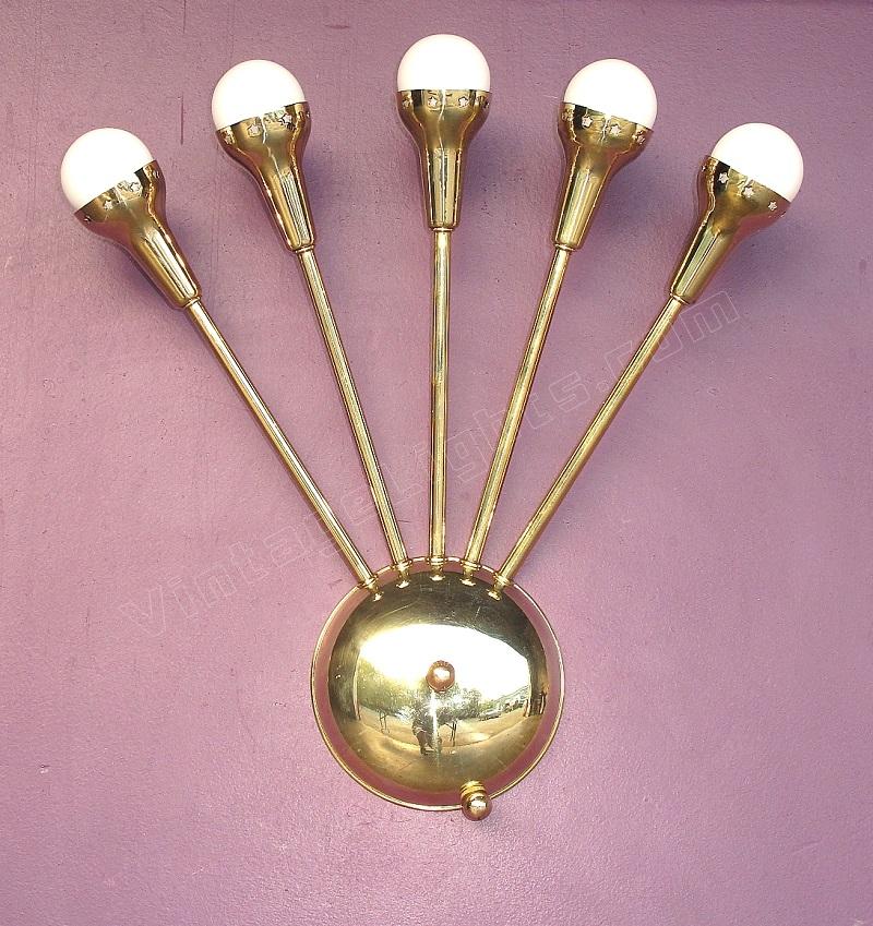 Killer 5 bulb wall sconces. All parts solid brass not plated. Re wired and polished to bring back their original luster. Bottom turn switch is a 3 way switch which will turn on 2, 3 or all 5.