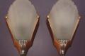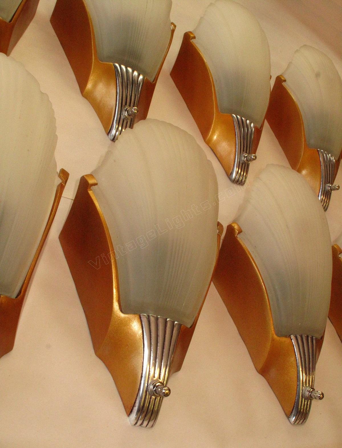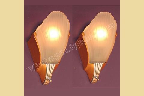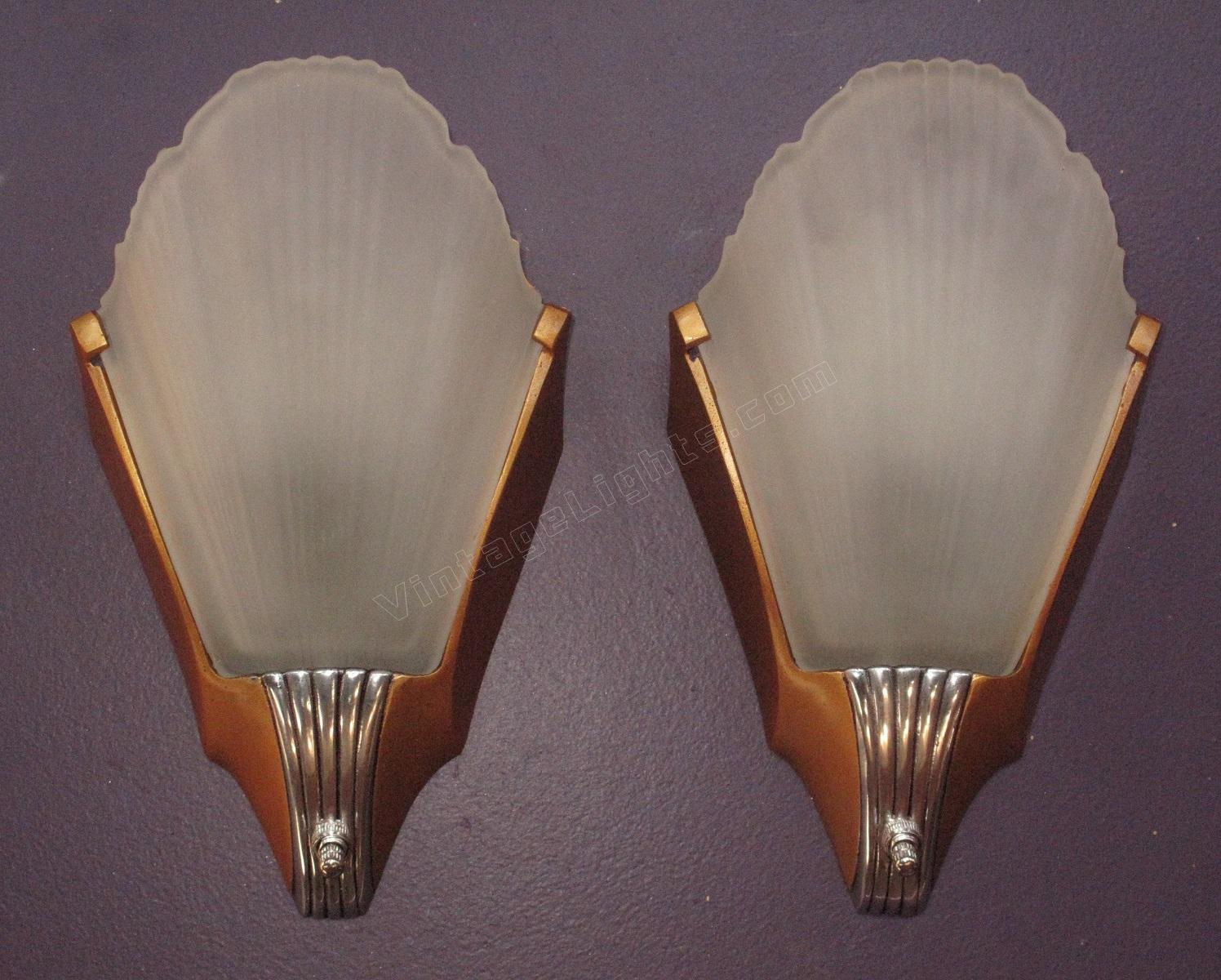 Although from the 1930s these slip shade wall fixtures are showing the distinct trend of what would become known as Mid-Century Modern. During the Great Depression manufacturers began to strip away the exuberant designs of the 1920s in order to cut cost, resulting in the Streamline design and Mid-Century Modern.
