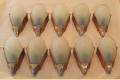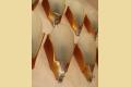 These have been re-polished down the center lines and refinished to match the original colors. The glass slip shades are clear frosted which show a warmer in the pictures. Images with out the light bulb on shows the true color of the shades.