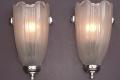 Art Deco style sconces. I can see them lighting the lobby in an old Art Deco theater in Miami. Highly polished aluminum backs with subtle yet dynamic Art Deco design. Clear frosted shades which are in excellent condition. Rewired with new UL listed sockets and switches. Code required ground wire installed.