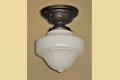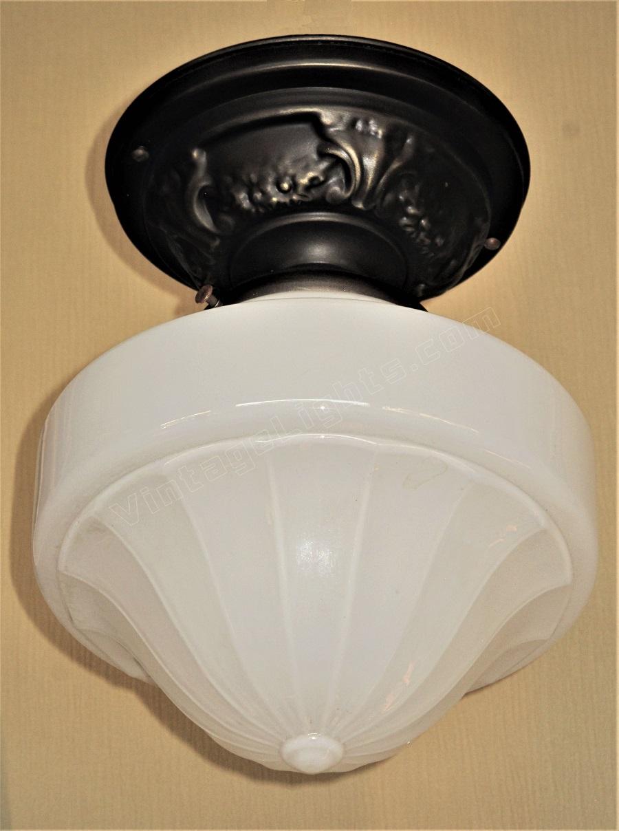 Just one milk glass vintage shades on brass ceiling fitters. Perfect for a bungalow kitchen or bathroom. Their mid range size make them a candidate for any room in a cottage, ranch, craftsman or bungalow home.
