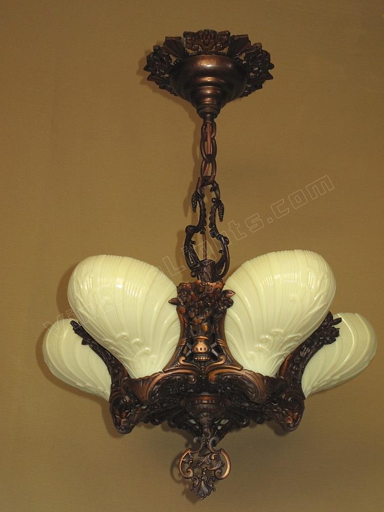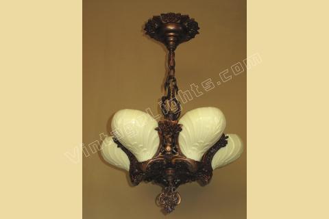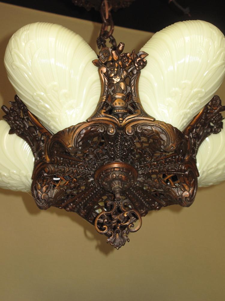 Vintage Bronze with Custard Glass Slip Shades. Deco Rococo Masterpiece. Original Patina