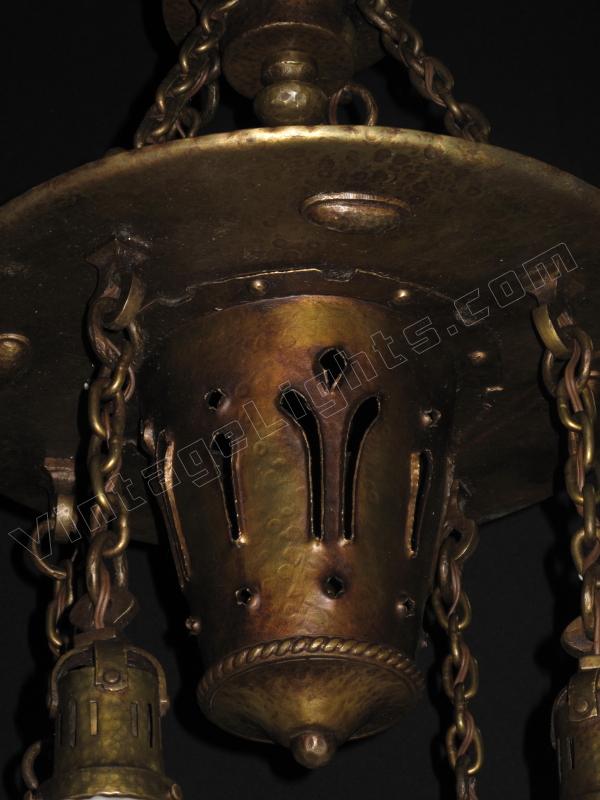 Magnificent example of the artistry from the Arts & Crafts era. This massive eye-catching centerpiece vintage fixture is 17 inches wide and drops aprox 30 1/2 inches. Original patina on this hand wrought and hand hammered antique lighting fixture. Even the chain has fused links. Original sockets dated 1909.