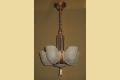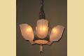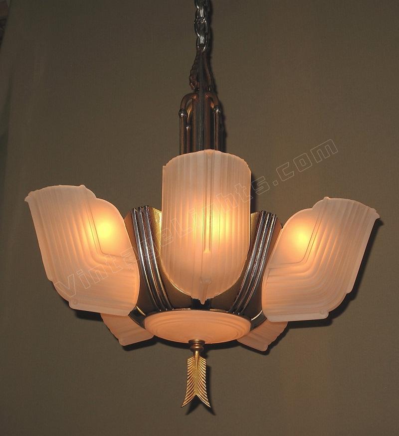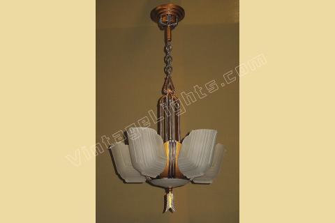 All glass is original and in excellent condition. There are 7 sockets which include two in the bottom shade. 60 watt max for the two bottom bulbs and 75 watt max for the five outside bulbs.