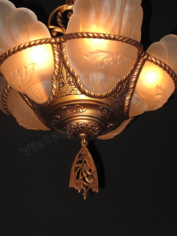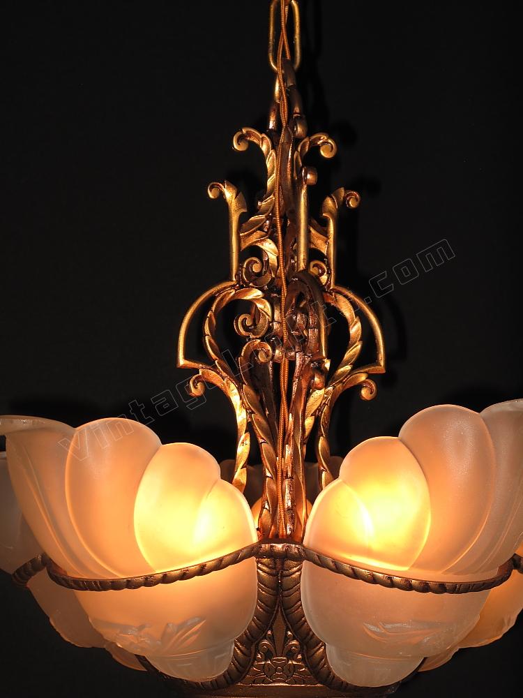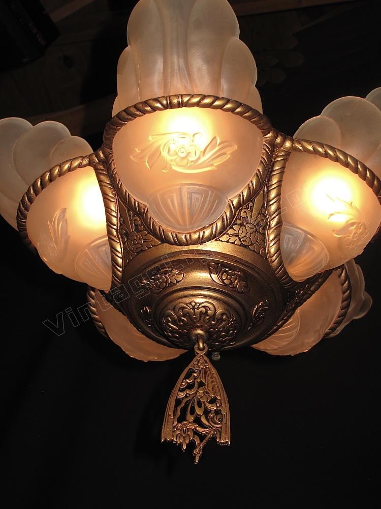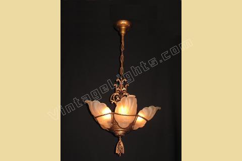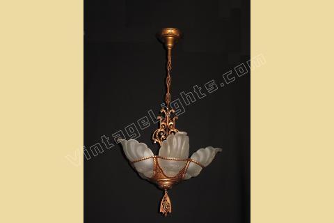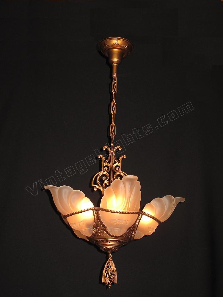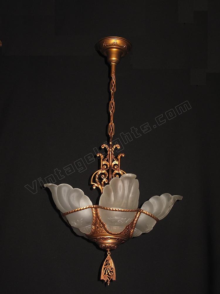 1930s Vintage Art Deco Slip Shade Antique Lighting Chandelier