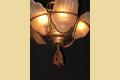 Unique design in the "slip shade" genre of vintage light fixtures. The delicate rope twist shade keepers are a nice contrast to the overall heft of the chandelier. Again a delicate, intricate design is found in the riser from the center of the lighting fixture. A very nice balance.