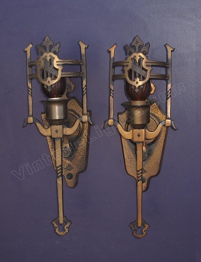 4 Pair Vintage Solid Bronze Tudor/Revival Style Wall Sconces; priced per pair