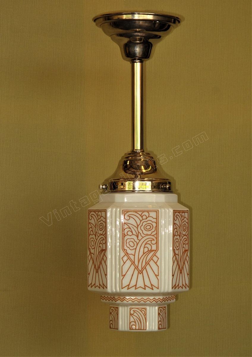Wonderful vintage deco inspired reddish/tan stenciled design fired onto a milk glass globe. On the modest size with the shade itself is 9 inches high and 6 inches wide. Shown on a new nickel plated fitter. Overall drop with fitter shown is 19 inches. Drop can be adjusted down to about 14 inches and adjusted longer, usually at no charge.