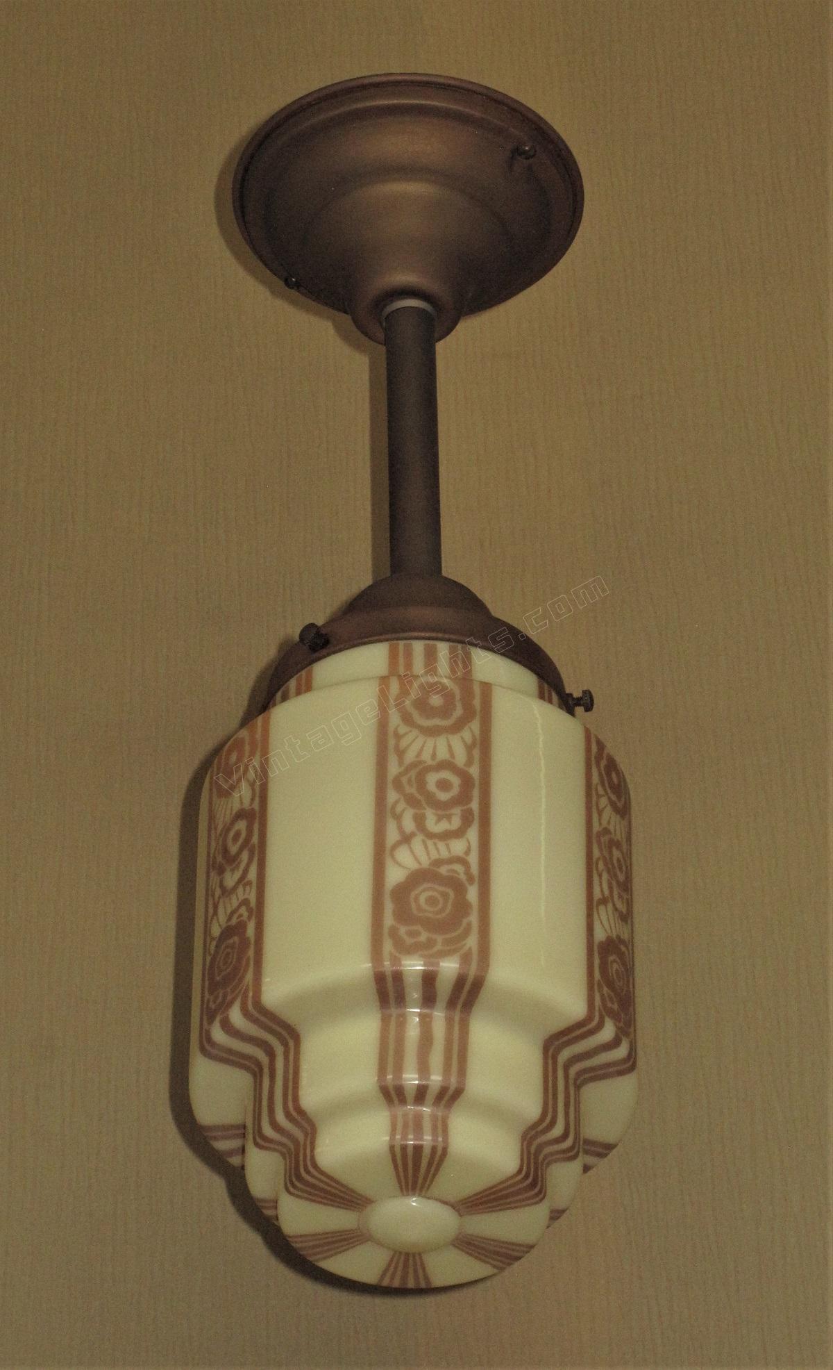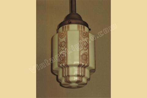 Six waterfalls of tan stripes and art deco inspired flora surround the stepped cylinder custard globe, all meeting around a button at the bottom. The way the stripes follow the contour of the stepped shoulders create a feeling of movement, like watching someone slowly pulling taffy.