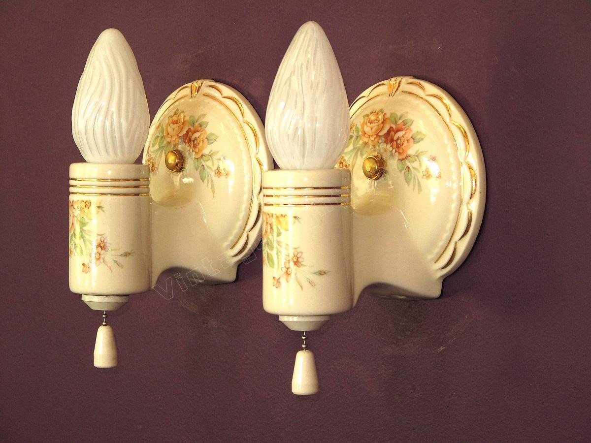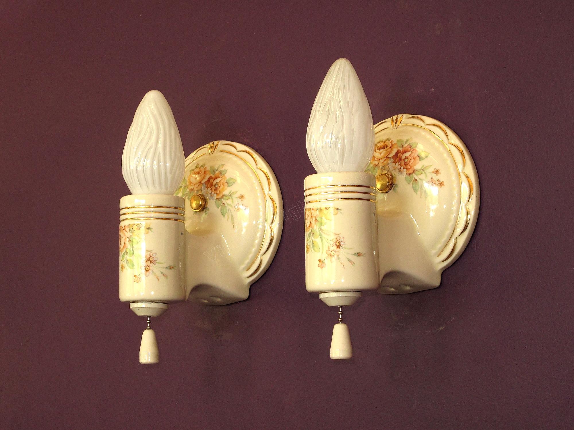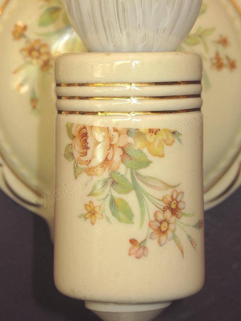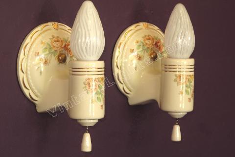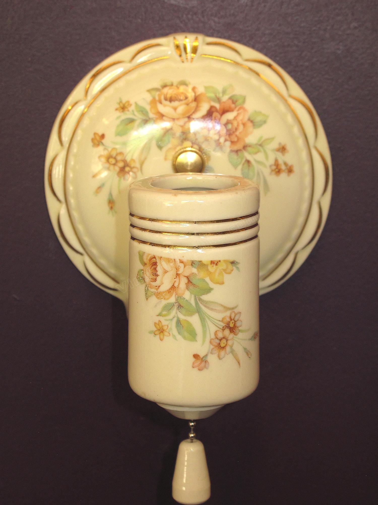 Nicely detailed floral decoration fired onto the porcelain back plate. Background is off white to light cream color. A little color variation between the sconces in the flowers but not very noticeable at all. Designed as a bare bulb fixture, bulbs not included