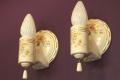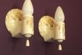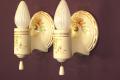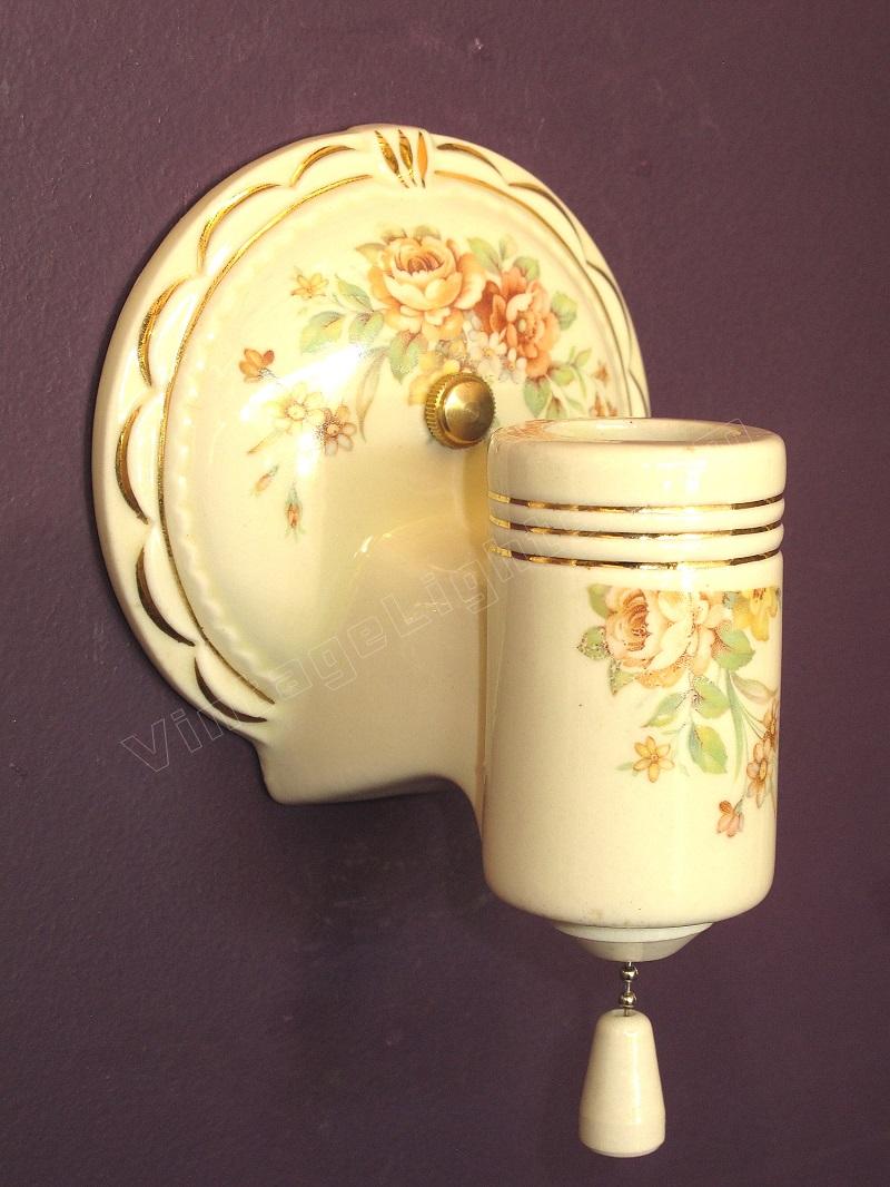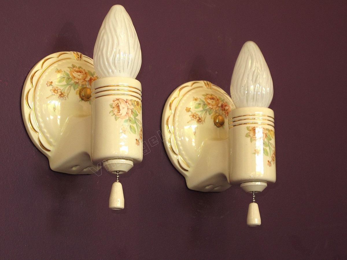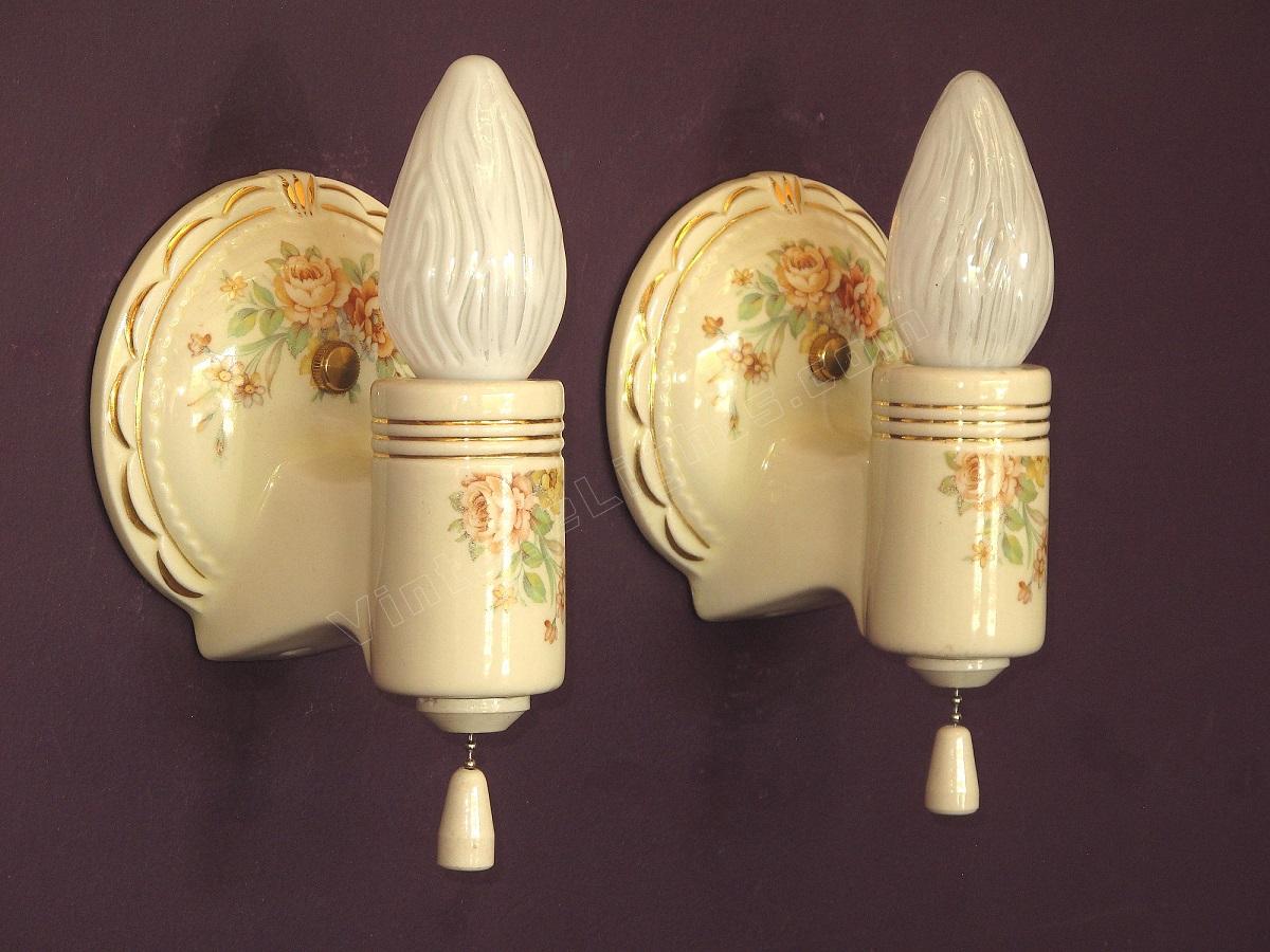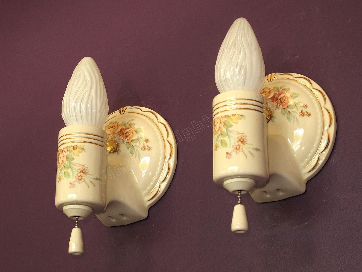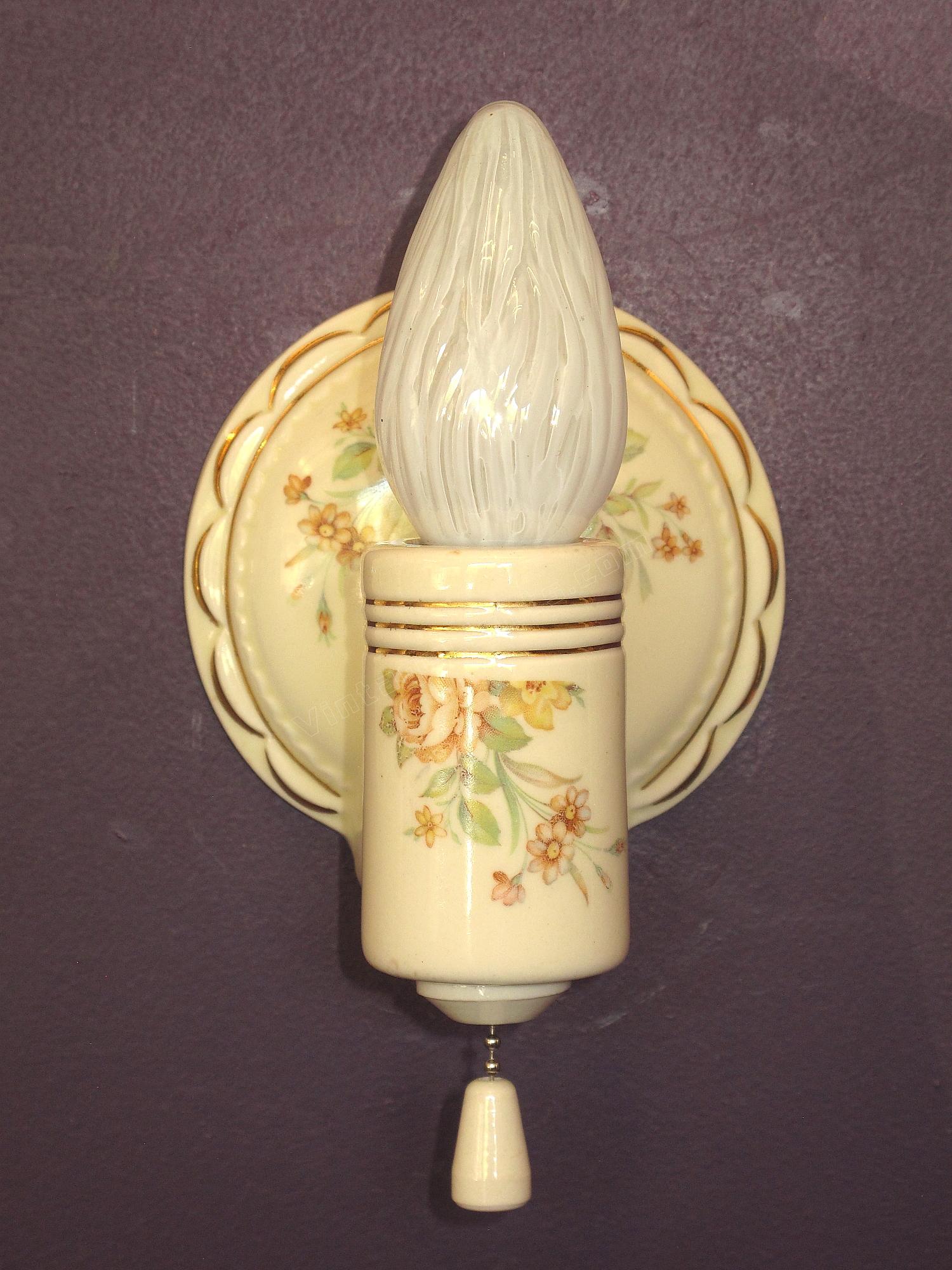 Nicely detailed floral decoration fired onto the porcelain back plate. Background is off white to light cream color. A little color variation between the sconces in the flowers but not very noticeable at all. Designed as a bare bulb fixture, bulbs not included