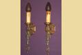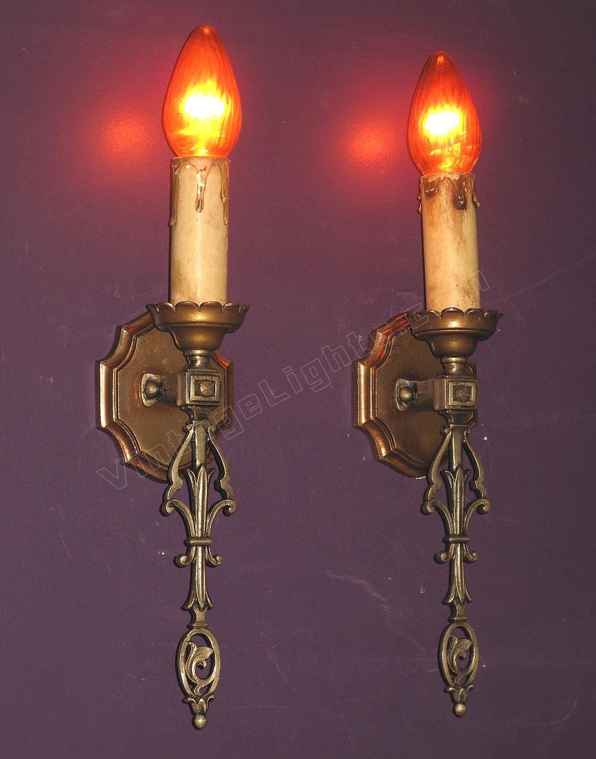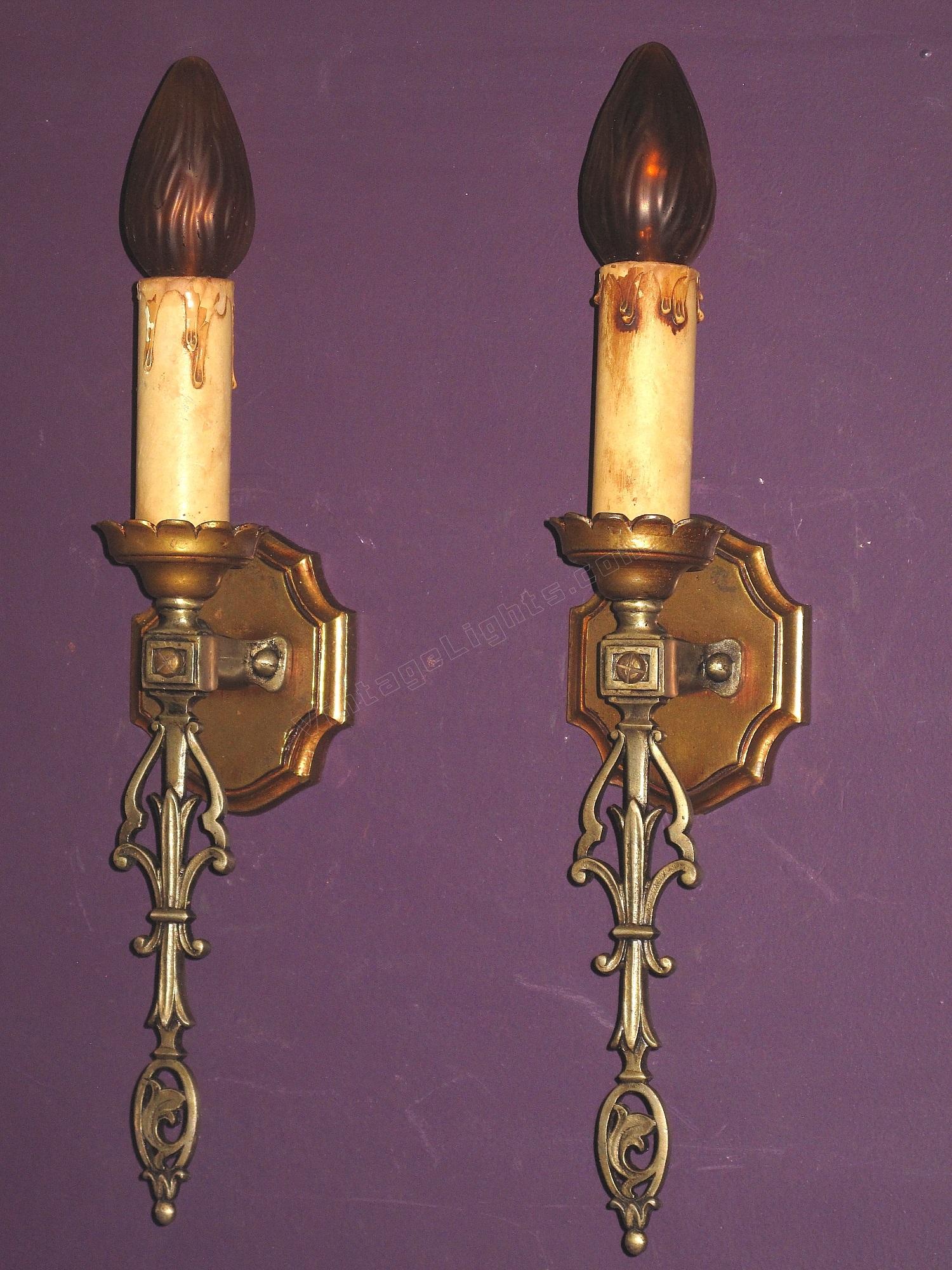 In keeping with the French Revival, or Eclectic style, these are both elegant and simple at the same time. The bottom oval contains a flowing Fleur de lei with another more straight forward Fleur de lei hidden half way up the staff. The crest shaped back plate along with the castle top plates on the bottom of the candle sleeves again show the European influence these carry.