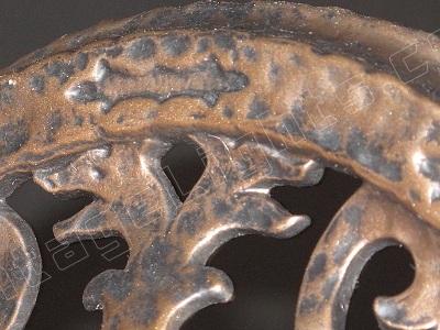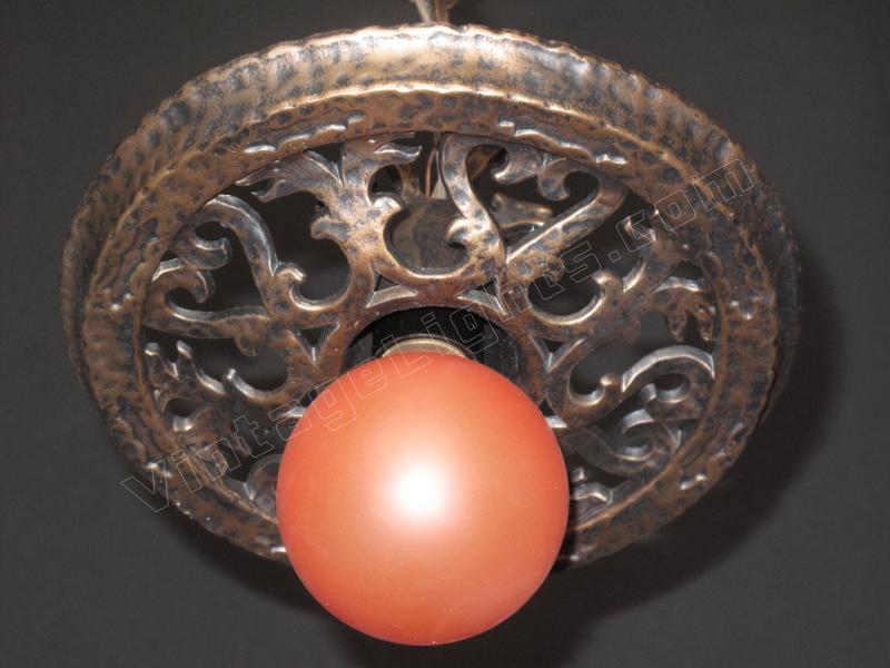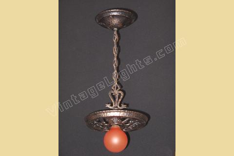 Another example of the "Dogs Head" series of antique lighting fixtures by Virden of Milwaukee. These cast iron vintage fixtures date to the late 20s to early 30s, during the "Revival" design trend of the time. Solid cast iron refinished in one of their original colors, antique bronze. Vintage colored bulb shown for reference only, not included. This vintage fixture is also seen in a flush mount style by removing the chain assembly. Bulb not included