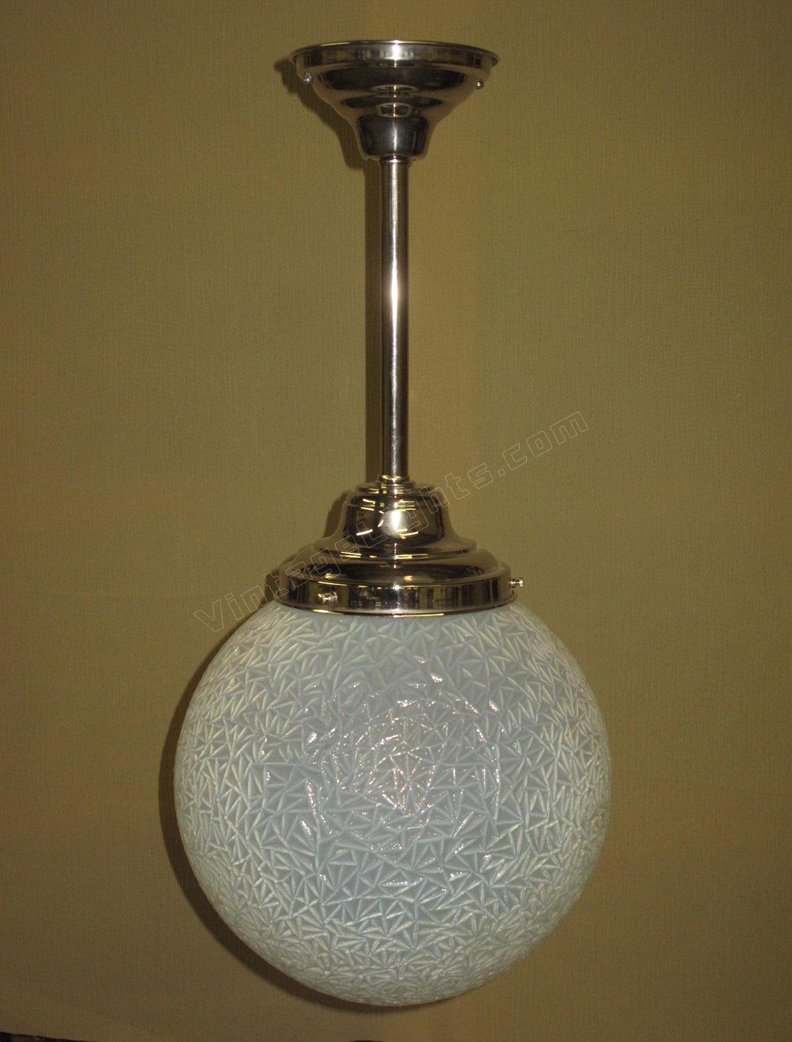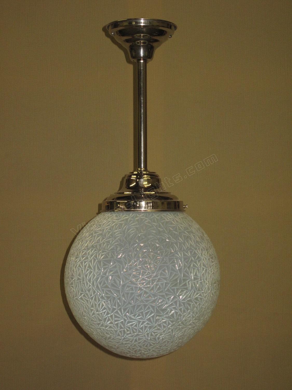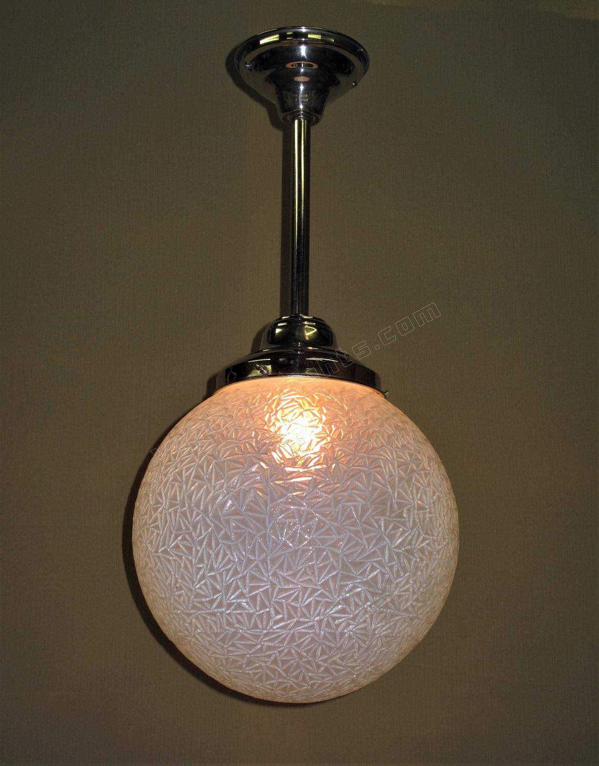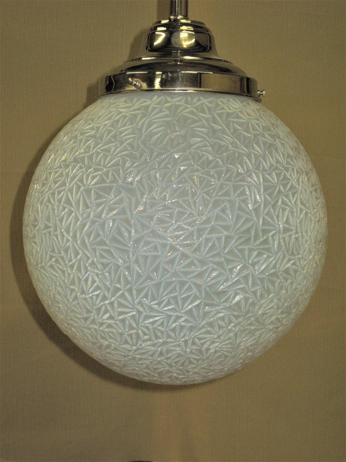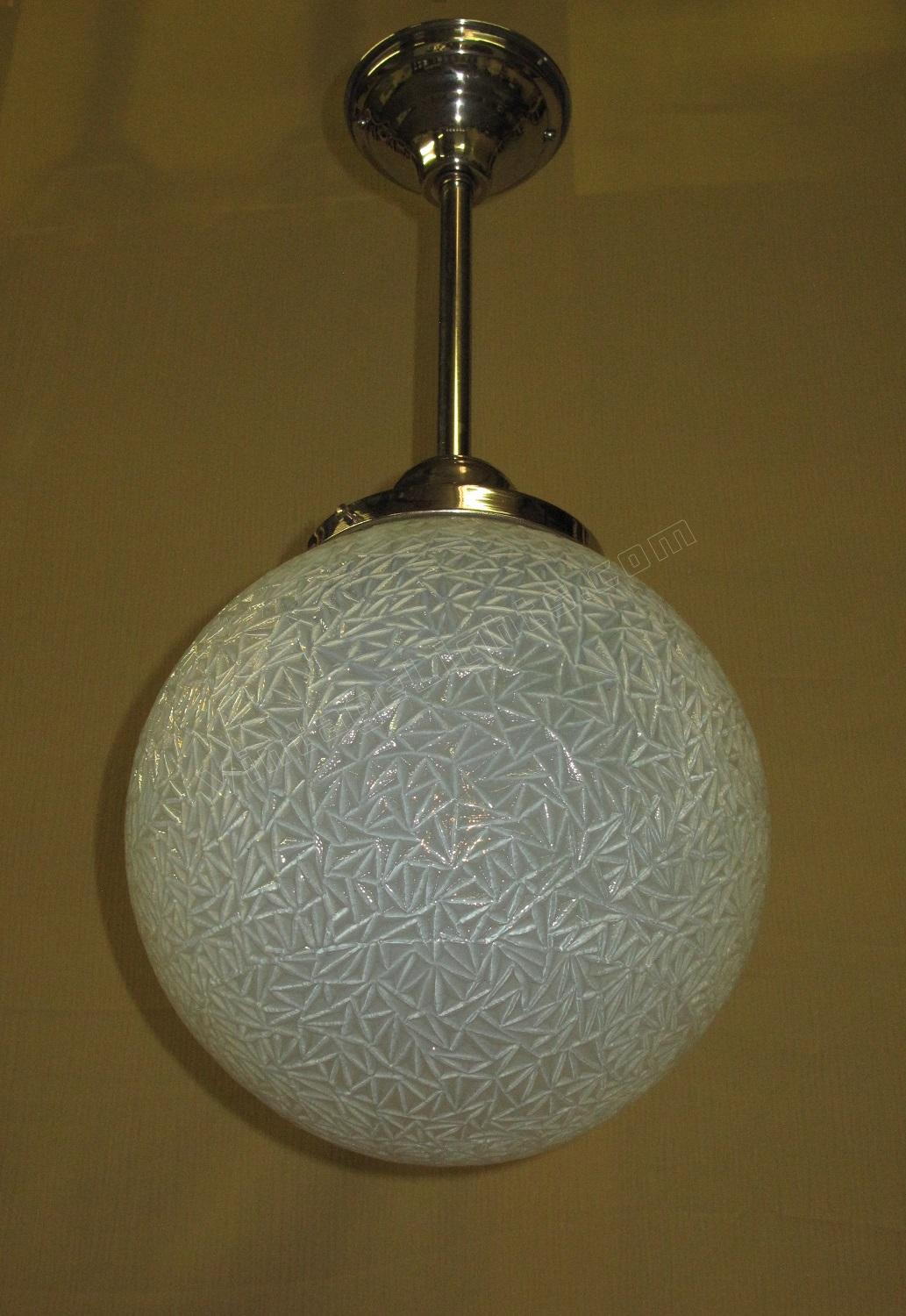 12 inch round blue globe with a detailed surface commonly referred to as ice due to the similarity of the way ice crystals form. Dates to the 1920s or early 30s and although it does not have an identifiable deco design we would confidently put this into the Art Deco box. Not many fixtures can add the amount of intriguing texture to a room the way this one does.