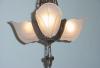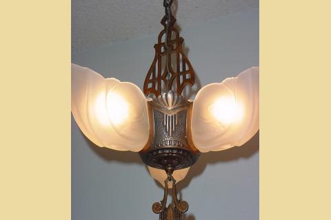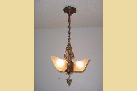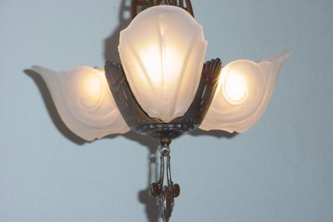 Late 20s vintage 3 Slip Shade lighting fixture. Antique glass light shades